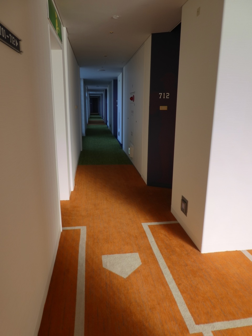 ライオンズがキャンプで宿泊するホテルなので、ライオンズ一色のフロアがあります。本塁、マウンド、2塁のベースがあるので距離感がわかります。あと素晴らしいのはお風呂。露天風呂もオーシャンビュー。灯台の灯や月の道を見ながらの入浴は最高です。
