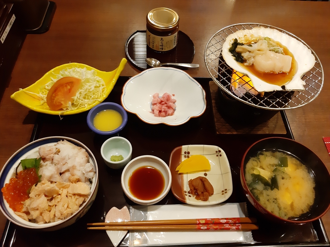一覧を見る朝食のイクラ+鮭+真鱈の三色丼や、ホタテの貝焼きがおいしいお宿