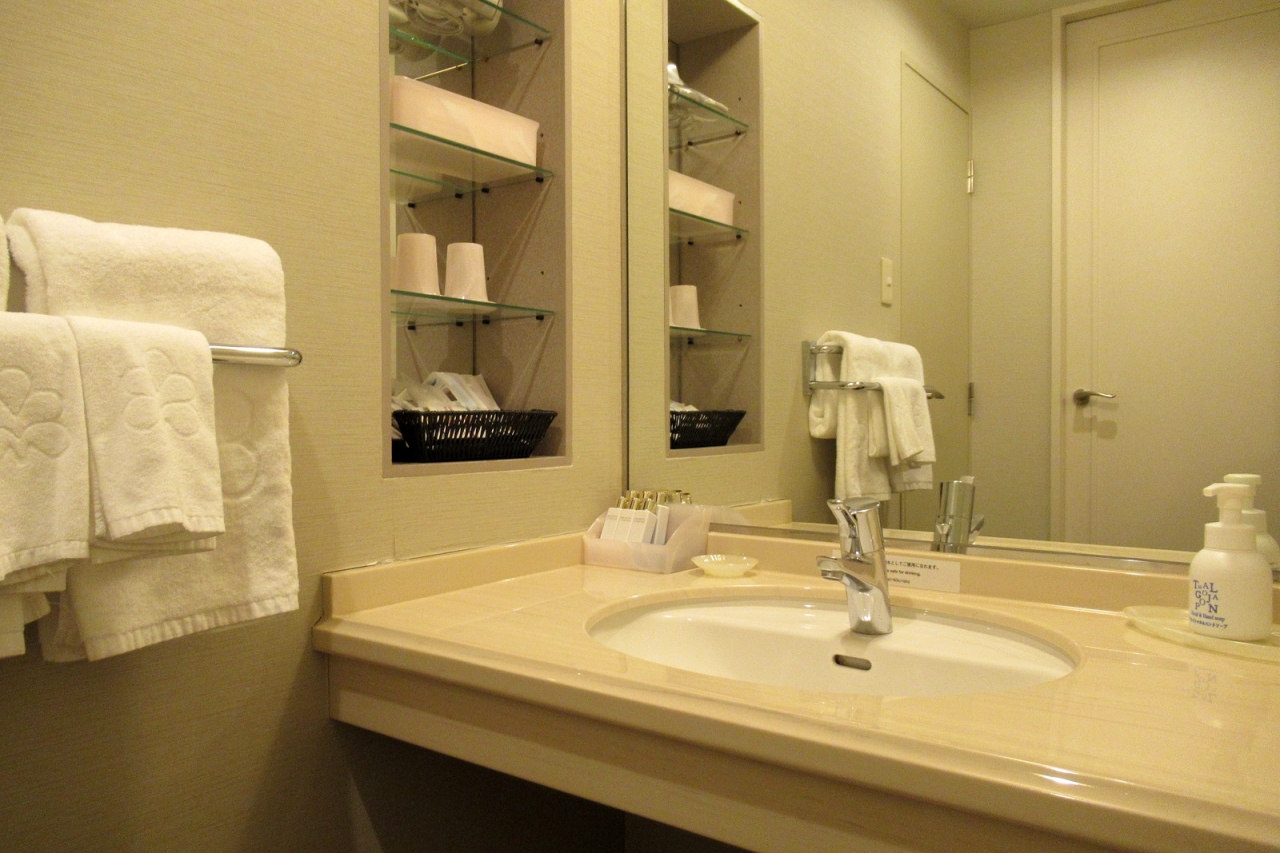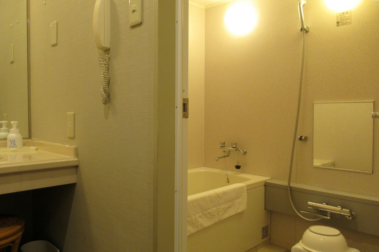 - 入口に段差のない風呂場は洗い場付きでアメニティはミキモト、大浴場もあって快適・快適