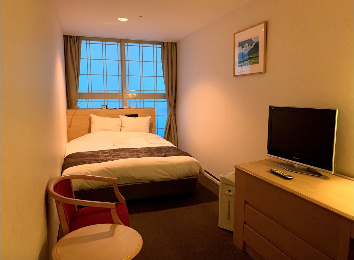 建物自体も古めで、縦長のワンルーム使用のお部屋はホテルでは珍しい形。奥にある窓を開けられないのも含めて少々圧迫感がありました。