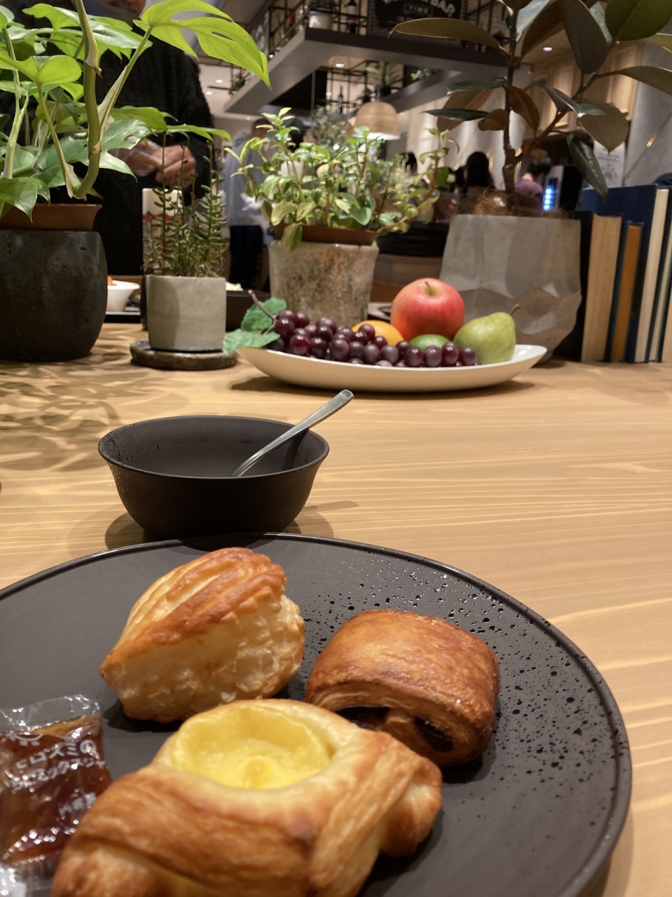 朝食会場はわりと広々としていて、木のテーブルやグリーンを配しており、ちょっとお洒落なカフェ感がありました。フレッシュベーカリーからのパンのほか朝食は期待より充実していました。