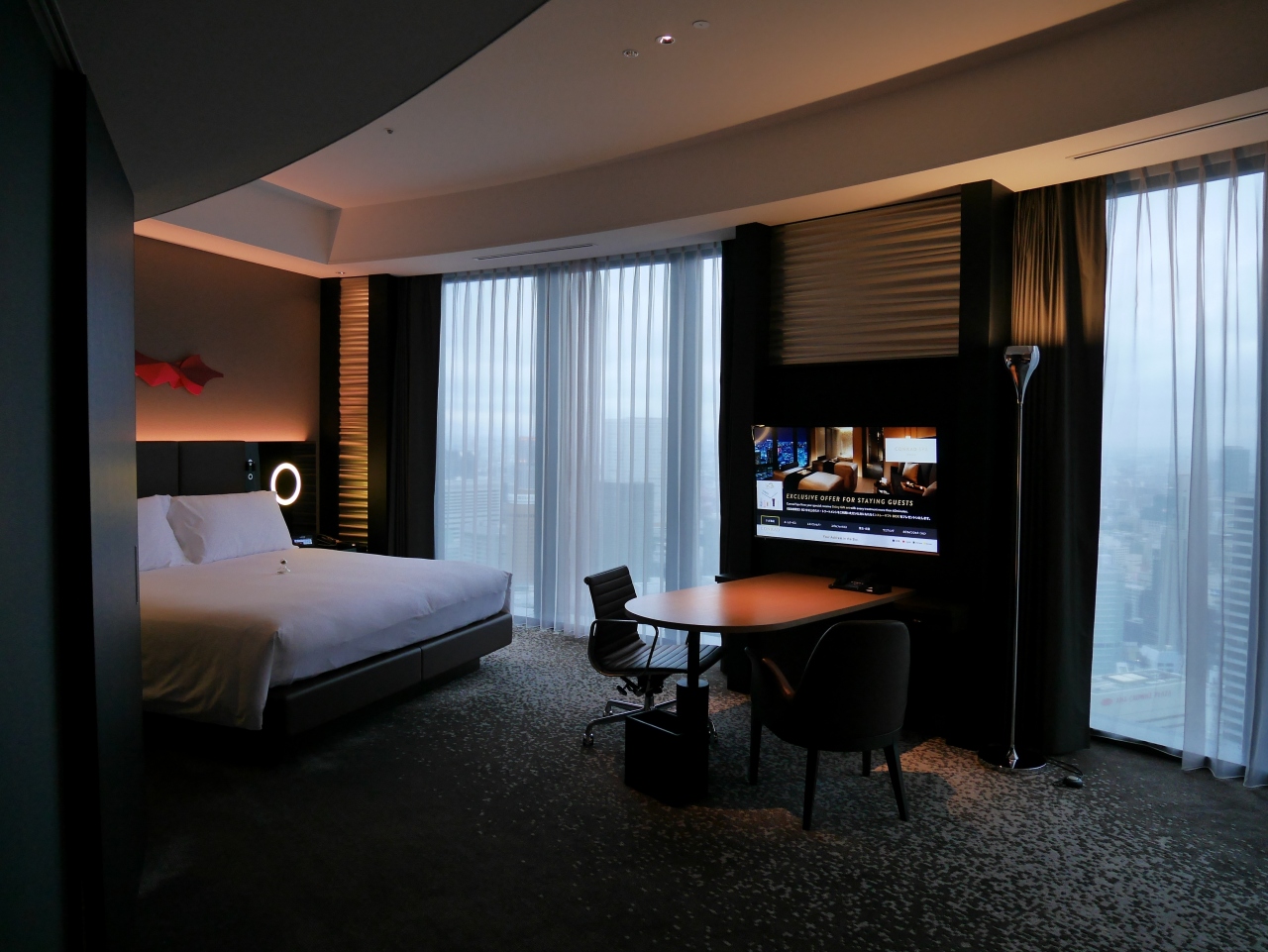 中之島のフェスティバルタワー、40階に上がるとそこがコンラッドホテルのロビーです。エレベーターを降りるとまず眺望の素晴らしさに目が惹かれます。そして入り口に白い巨大ななアート。ホテルの方に尋ねると、風神雷神をモチーフとしたものだそうです。客室からの眺望も素晴らしく、ゆったりとした時間を過ごせました。ホテルでゆっくり過ごす時間のある時に使いたいホテルです。