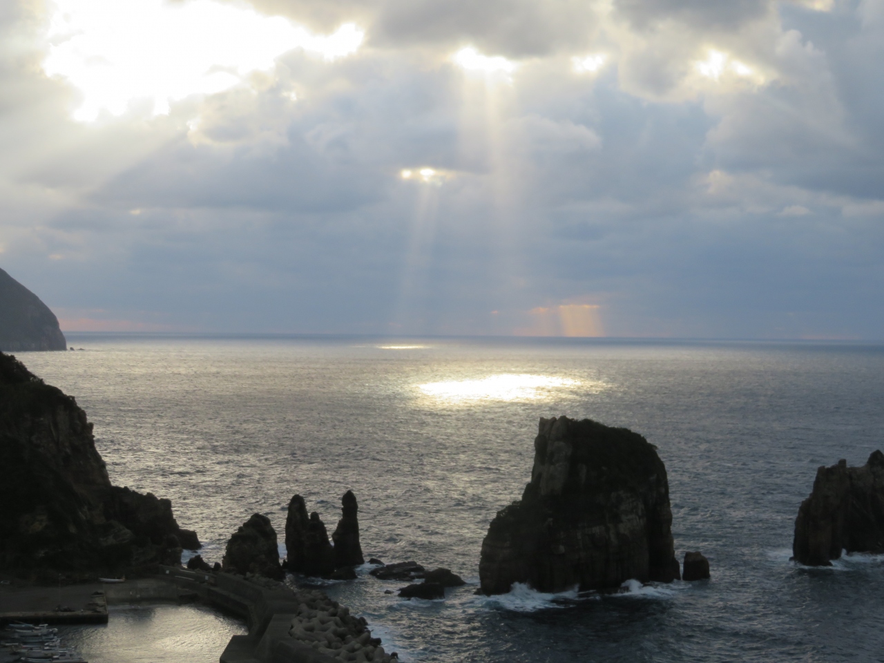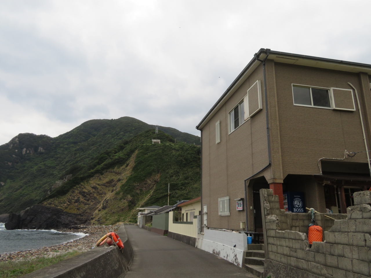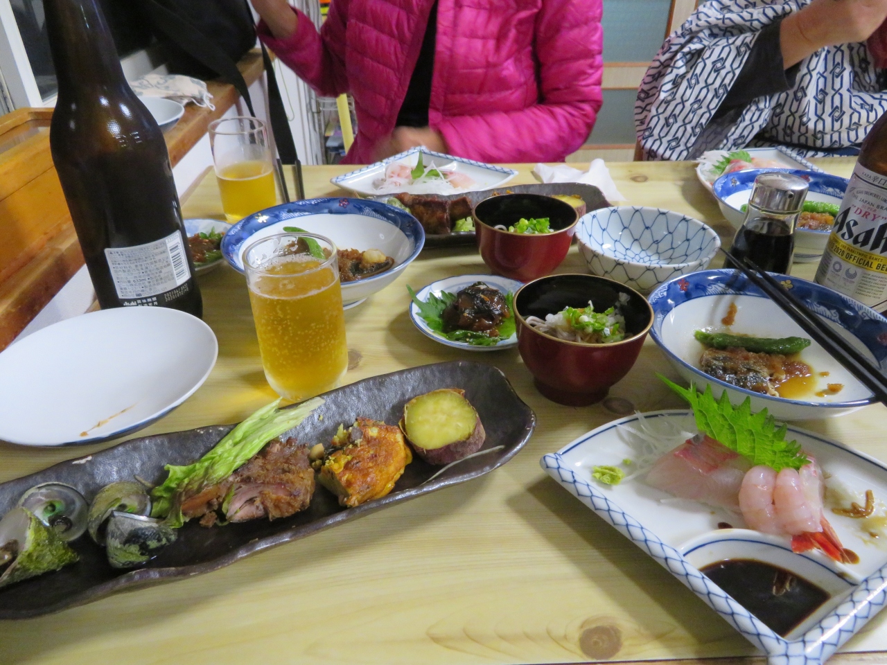瀬々野浦には民宿が2件あるうちの一軒。瀬々野浦湾に面し、部屋から瀬々野浦の奇岩が一望できる。宿経営の夫婦が気さくなためか、夕食時に地元の人達が飲みに来ていて、土地の話や私達出身地の話で盛り上がり、地元ならではの談話を楽しむことができた。朝夕食も当地の海鮮料理が並び、美味しく満足した。宿から目の前の防波堤を越えると奇岩の一つ鷹の巣やロウソク岩の地層に触り、波間にナポレオン岩を眺める景色は素晴らしい体験だった。夕日の前に雲間から差し込む太陽の光がスポットライトのように波間を照らし、奇岩のステージを盛り上げていた。