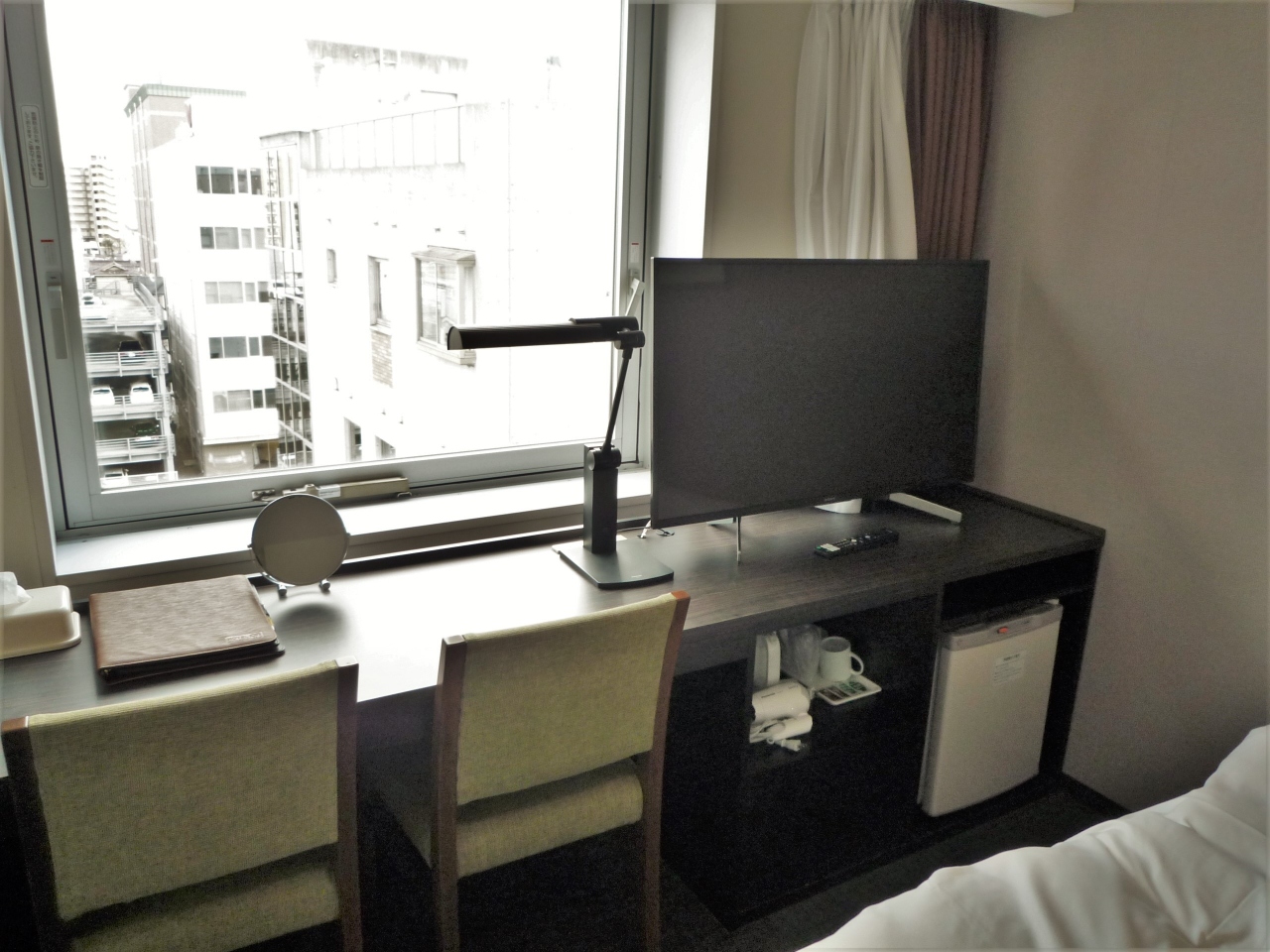 ダブルを利用したからかもしれないが、ベッドは150cmはあろうか?、窓一面に配置したデスクは広くて使い勝手も好い。