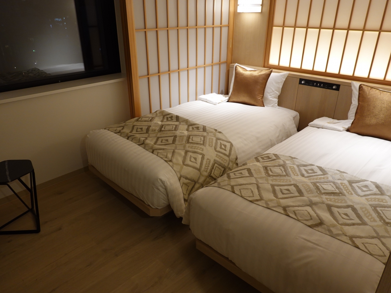 客室は20平米ほどの広さで、フローリングの床にベッドが2台、窓にはカーテンではなく障子と、和と洋の融合です。宿泊料金も手ごろでとても良いホテルでした。