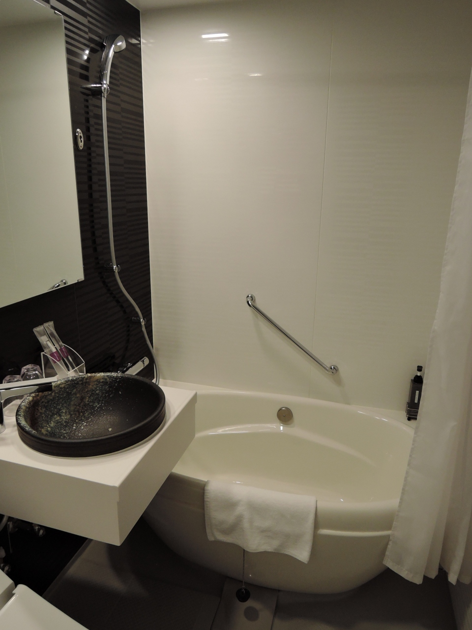 JR京都駅からは徒歩7分ほど。少し離れているが、それほど不便さは感じられない。入口からフロントまで長い通路がある。エレベーターのほうまでは途中ルームカードが必要。さらに、エレベーター内でもカードをかざして部屋へ。セキュリティ対策は万全だ。部屋は新しくて二人でも狭さは全く感じない。設備や調度品も満足できるものばかり。電源コンセントも部屋内の各所にあって便利。枕元のパネルで照明・エアコンの調節ができるのもいい。ベッドの堅さも丁度よく寝心地がいい。バスルームはそれほど広くはない。洗面台の小物が置けるスペースがもっとあるといい。バスタブは大きくて気持ちよく浸かれる。総合的にみると、コスパが高い観光・シティホテルと言える。