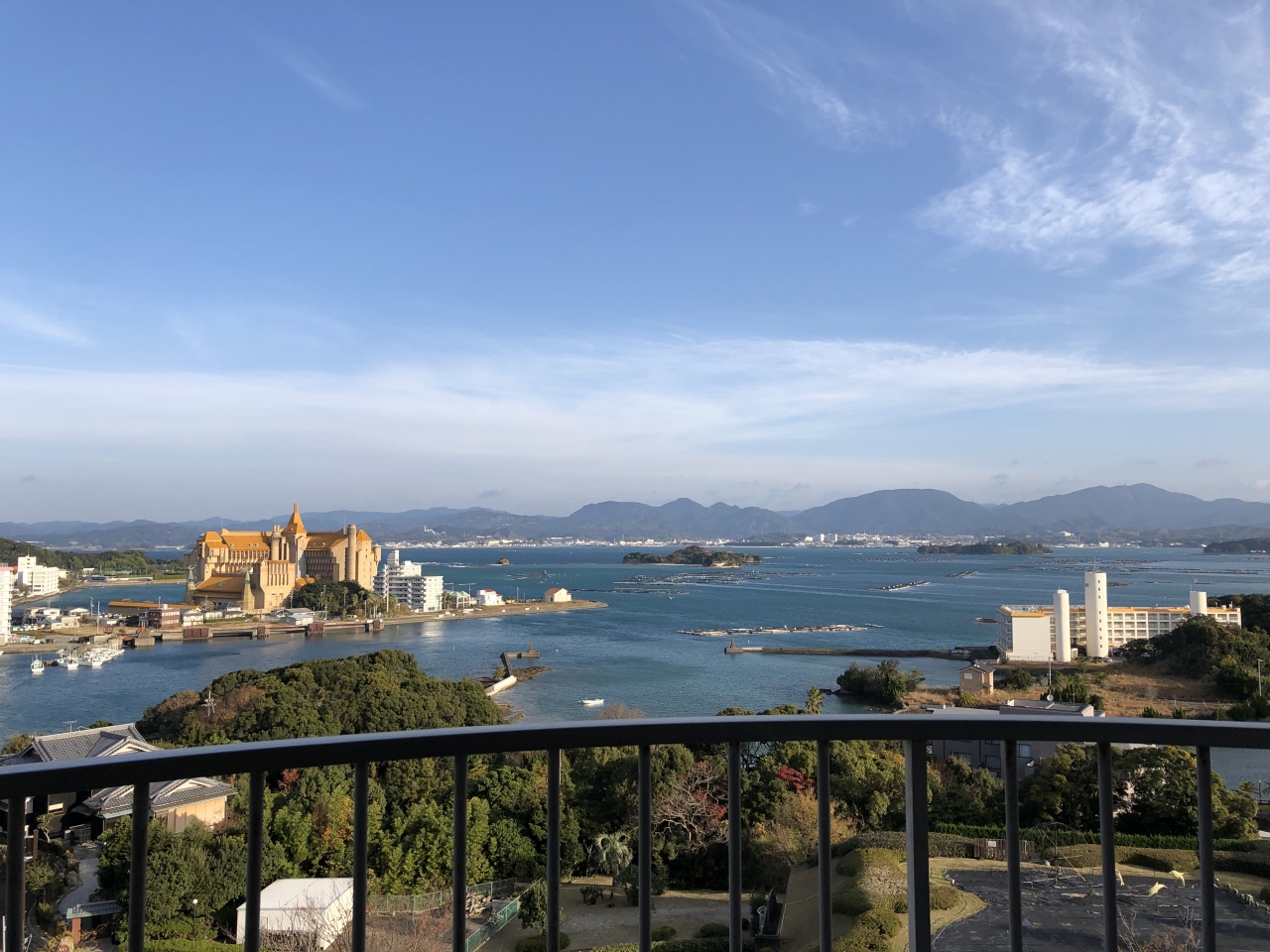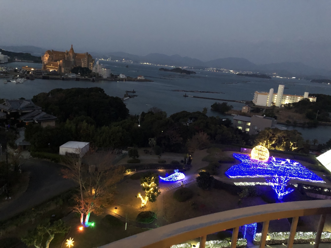 場所は少し不便ですが、高台に建つホテルの部屋からの眺めは絶景です。客室はすべてオーシャンビューで、広さも十分。夜には宿泊者だけが楽しめるイルミネーションもありました。また、バイキングの食事はレベルが高いと感じました。