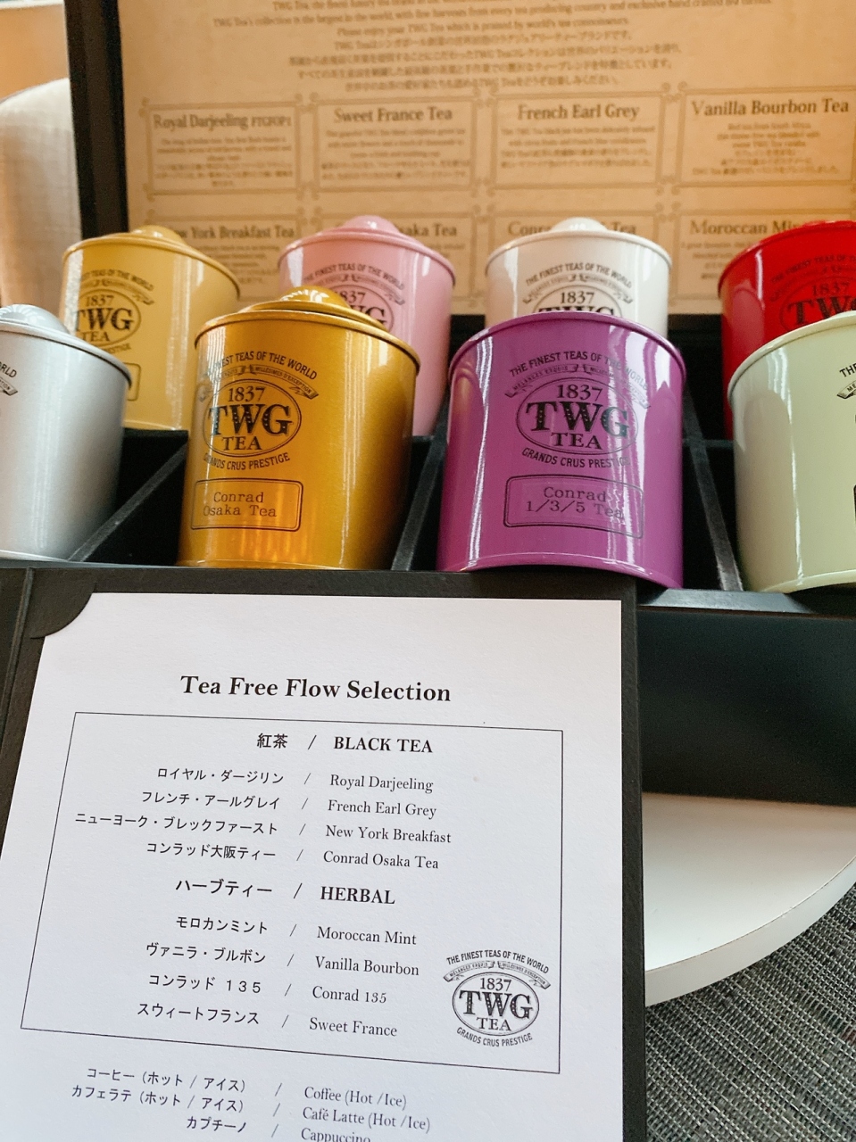 飲み物、紅茶はTWGが8種類から選べ、ほかにコーヒーもあります。