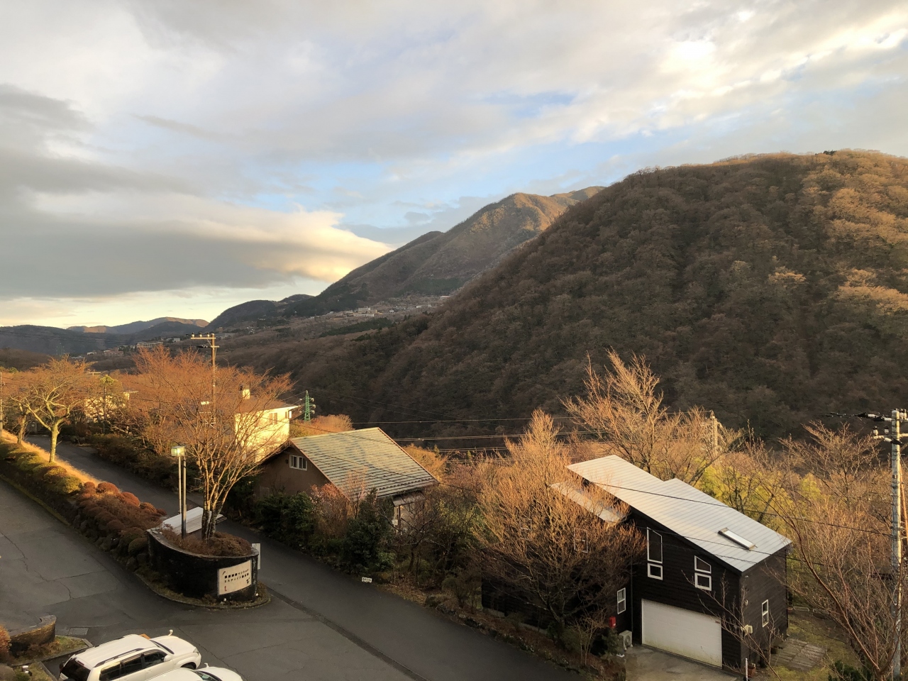 体験宿泊で1泊しました。2LDKで100平米超の間取りです。リビングダイニングの広い窓からは、正面に小塚山、その山のすぐ裏側にある大涌谷からの煙や、大涌谷へ行くロープウェイが見えました。