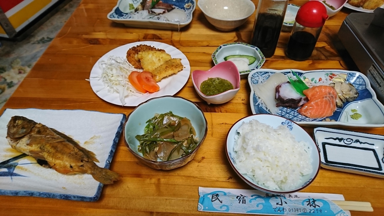 手作りの食事は奥尻の幸をふんだんに使っており、夕食にはお刺身やイカフライ、奥尻産の米など盛りだくさんです。ウニ鍋コースも予約することができ、これまた絶品鍋です。