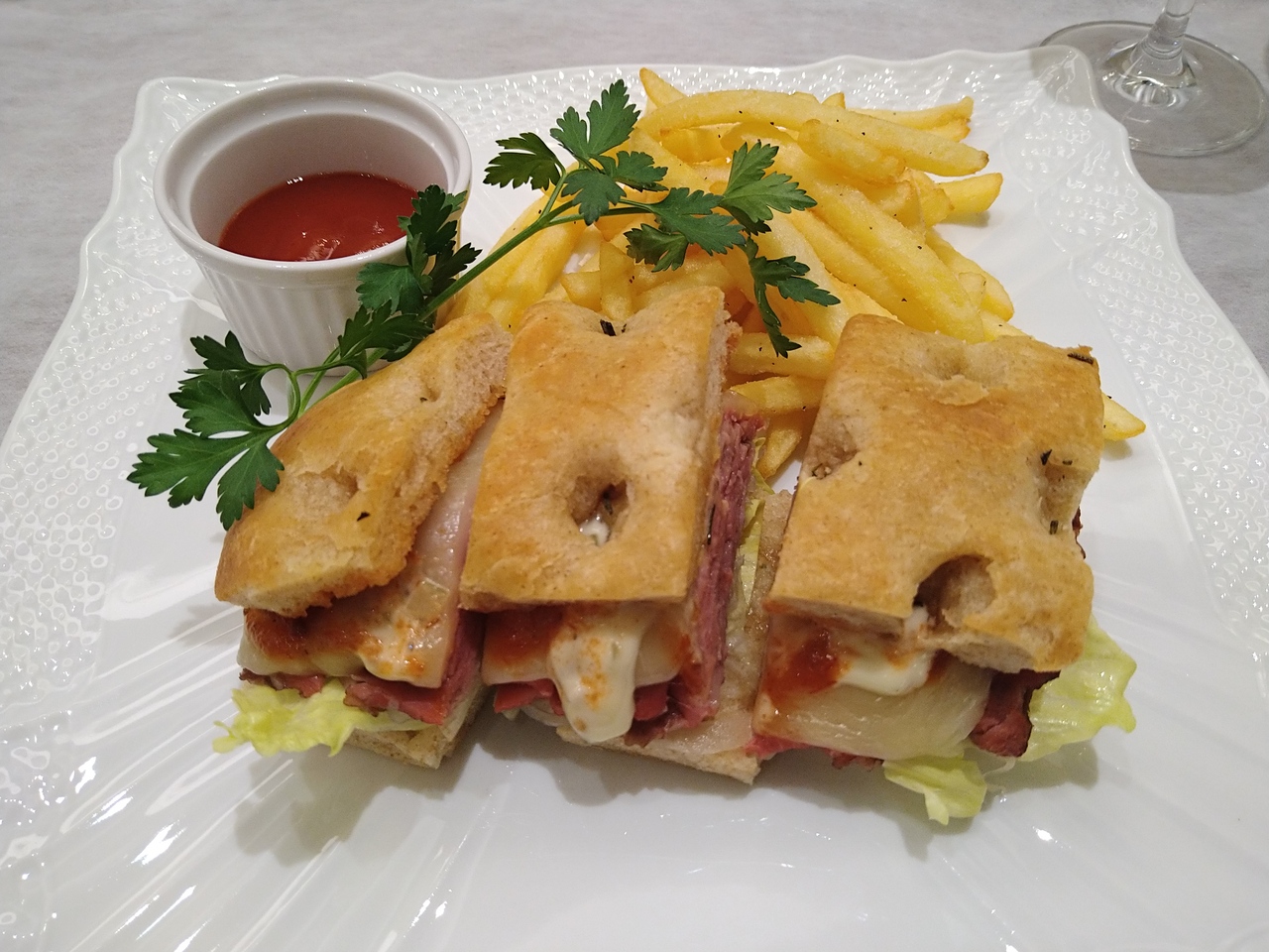 ホテルのレストランは衛生管理が徹底されており本当に気持ちよくお食事できました。あまり期待せずにローストビーフのフォカッチャサンドイッチを頼むと、ローストビーフがすごく柔らかくてビックリしました!美味しかったです。付け合わせのフライドポテトも好きですが、けっこうなボリュームでしたよ。