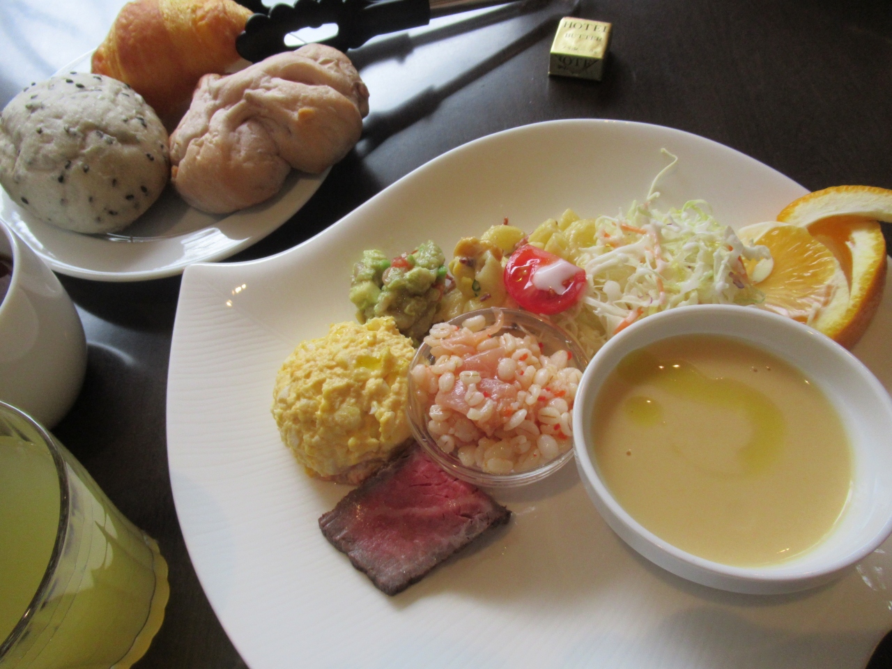 朝食はおかずプレートに、パン食べ放題でした。パンはとても柔らかくて甘みのあるものでしたので、好みが分かれるかもしれません。おかずのプレートはイタリアンの前菜盛り合わせのような内容で、白ワインが飲みたくなりました。このおかずならば、柔らかいパンではなく、シンプルなバゲットが欲しくなりました。