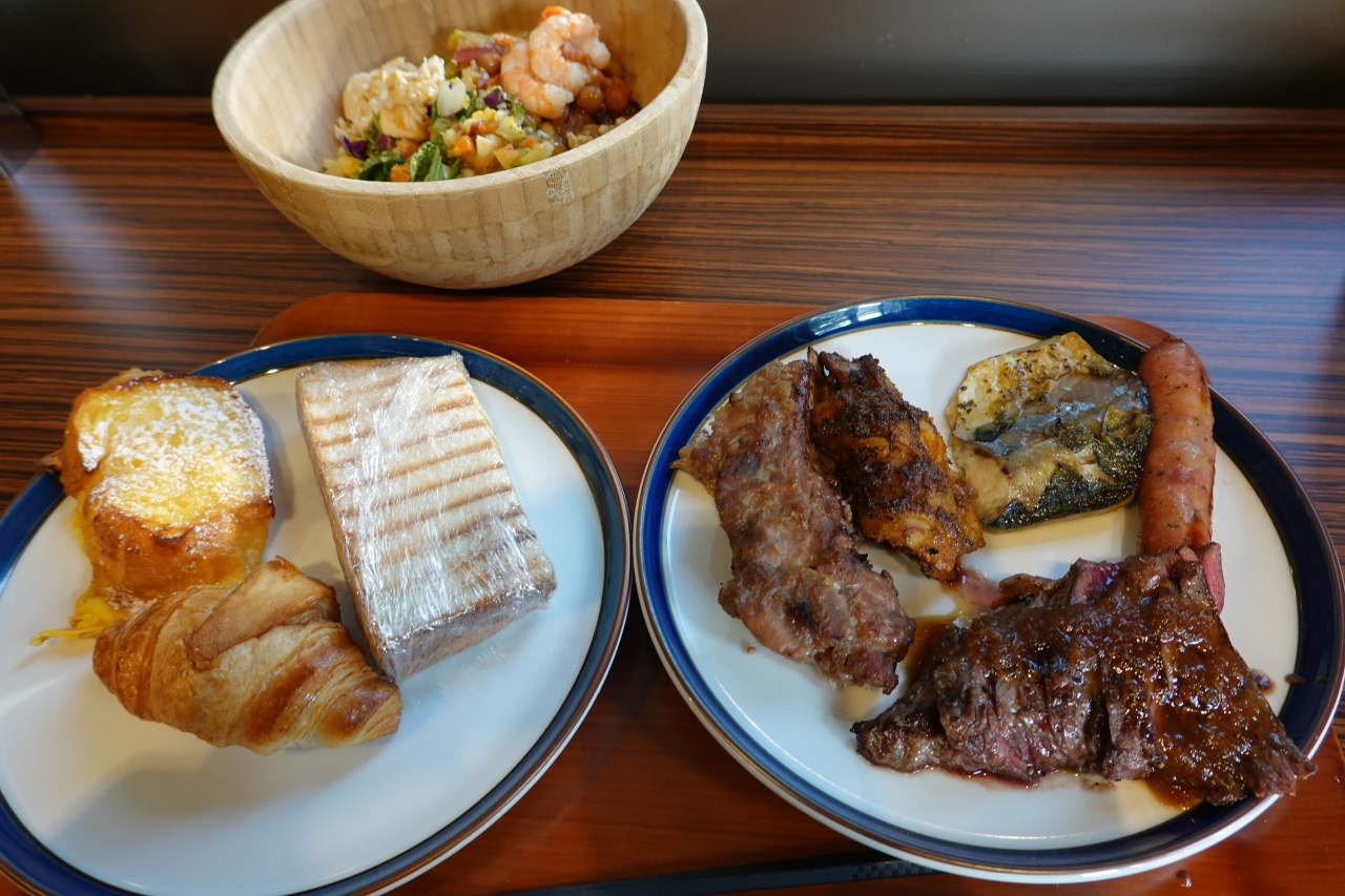 ただ、このホテルの売りは朝食。大満足でした。その場で焼き上げるBBQビュッフェでステーキやポークリブが食べ放題。1人前ずつ細かく刻んでくれるチョップドサラダで新鮮な野菜もたっぷり食べられます。クルミやボイルドシュリンプをトッピングしたら贅沢な味になりました。デザートやヨーグルトシェイクなどもあって、選り取り見取り。朝食だけでまた泊まりたくなるほど、かなり気に入ってしまいました。