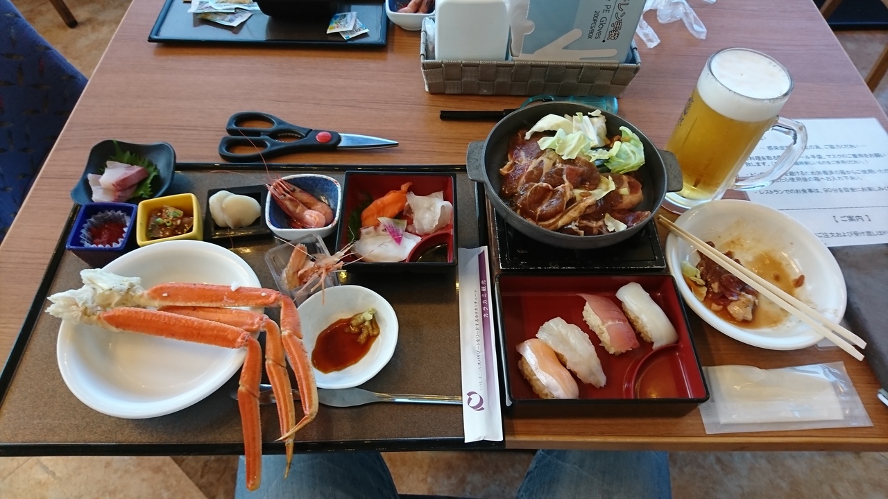 コロナだから料理を取りに行く時はマスクとビニール手袋着用。ビニール手袋はタラバやツブ貝を食べる時にも便利。