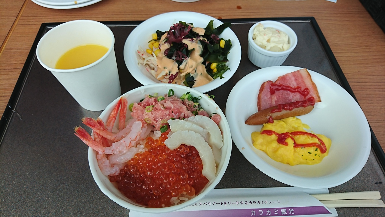 朝夕食のブッフェは種類が多く、ついつい食べ過ぎてしまった。朝から海鮮丼…(ウニは無い)