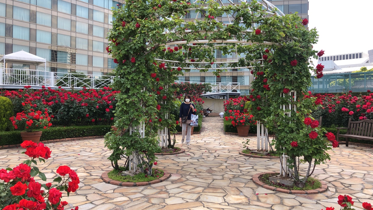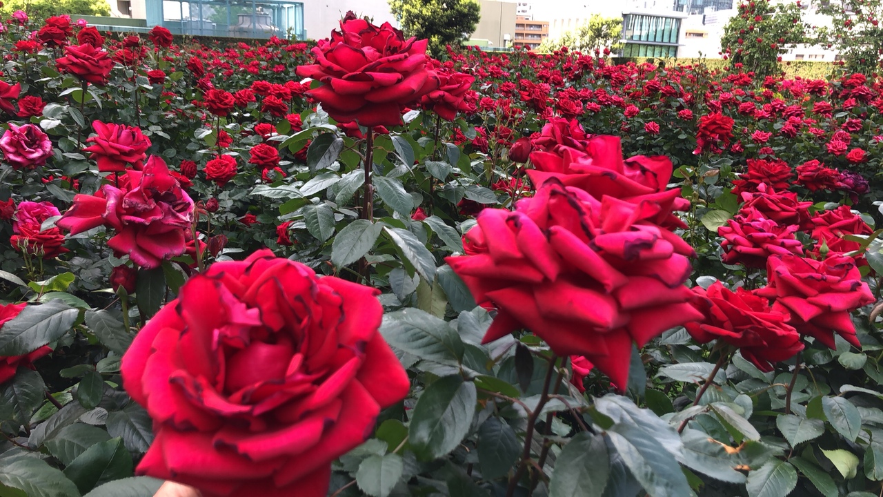 屋上からはビルビルビル、その目線を近づけると、真っ赤なバラ園がありました。