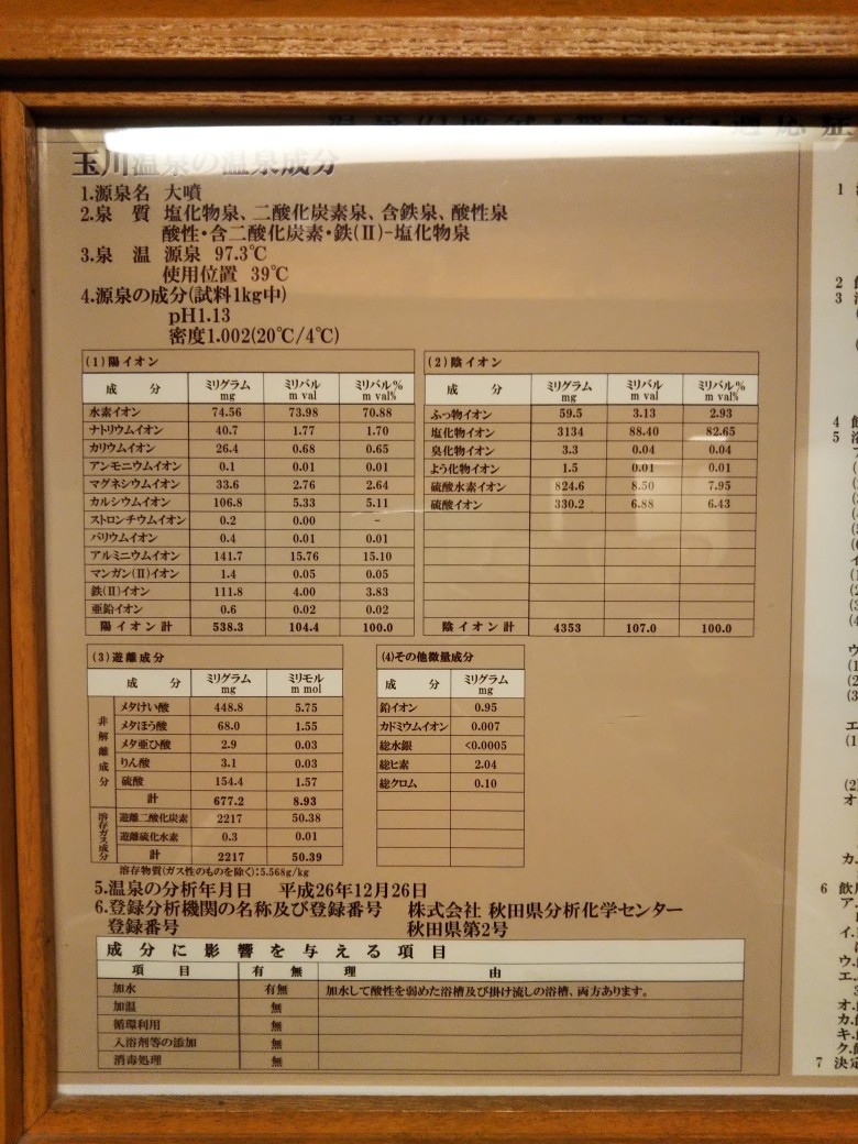 玉川温泉の姉妹館でもある新玉川温泉に宿泊しました。湯治宿的な玉川温泉とは違いモダンな建屋は館内もきれいで過ごしやすい空間を提供してくれました。温泉施設は湯治感満載で玉川温泉と同じ100%源泉や50%源泉、箱蒸し湯などがある他、露天風呂もあります。日本一の強塩酸の泉質(PH1.12)で入ると肌がピリピリします。部屋はモダンな洋室でお風呂の後に寛ぐには最適でした。食事はビフェ方式ですが地元秋田の名産(比内地鶏,キリタンポ)のコーナーもあり、おいしくいただけました。湯治的に2~3泊するのがいいなと思います。