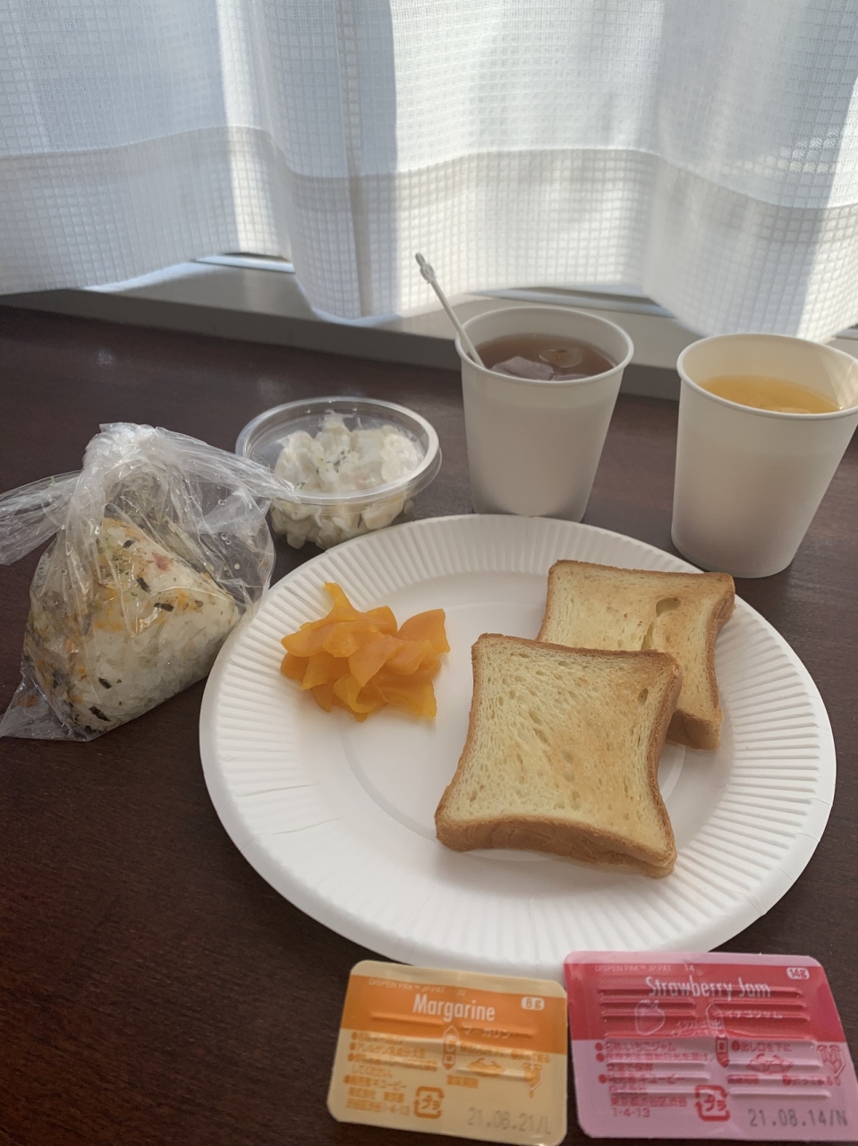簡単な軽朝食ですが、おにぎりもサラダもあって、部屋も快適に過ごせました。