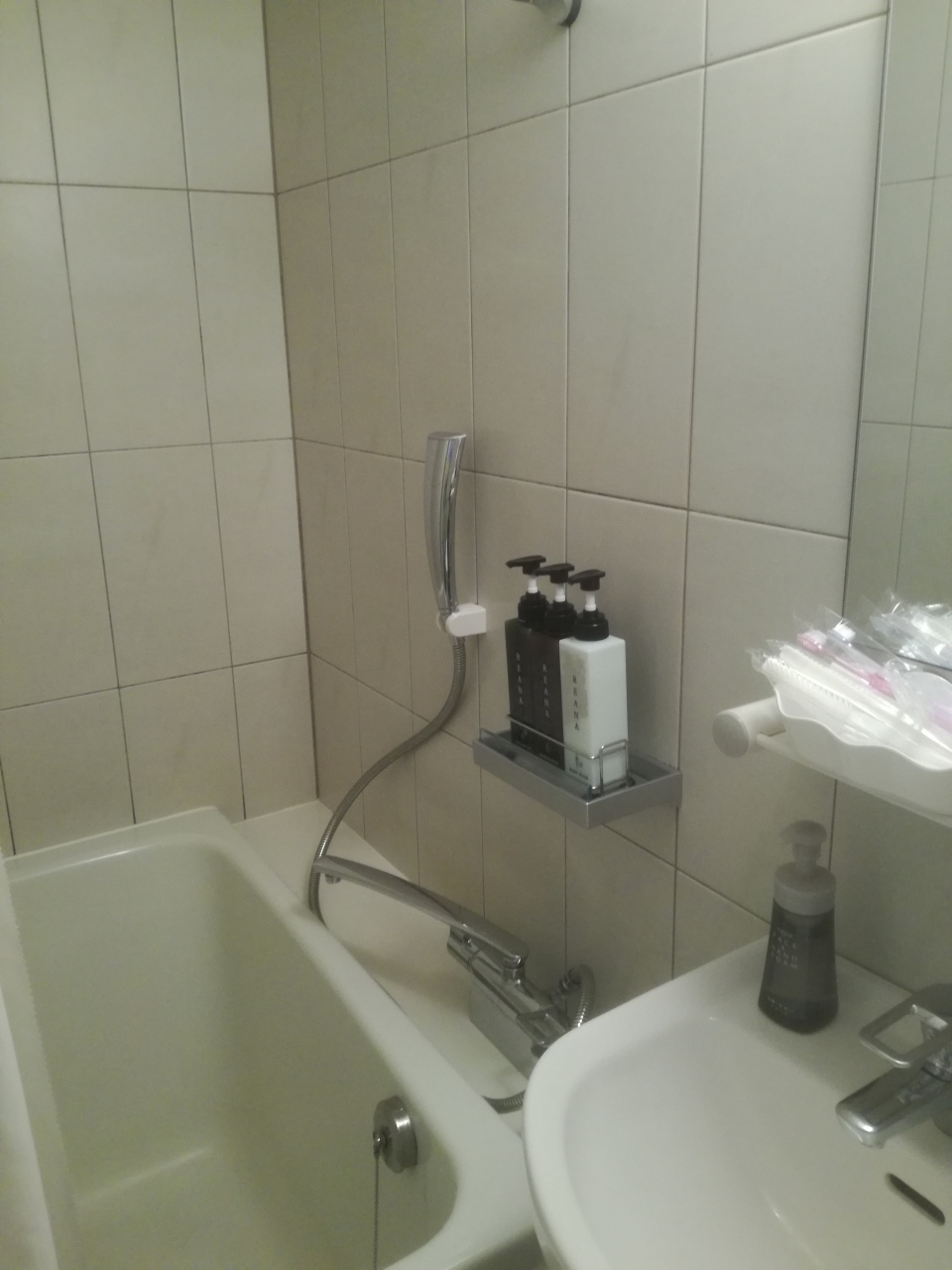 部屋のバスタブはサイドにシャワーカーテンが届かない所があるので、お湯が床に伝って落ちるため改善が必要。