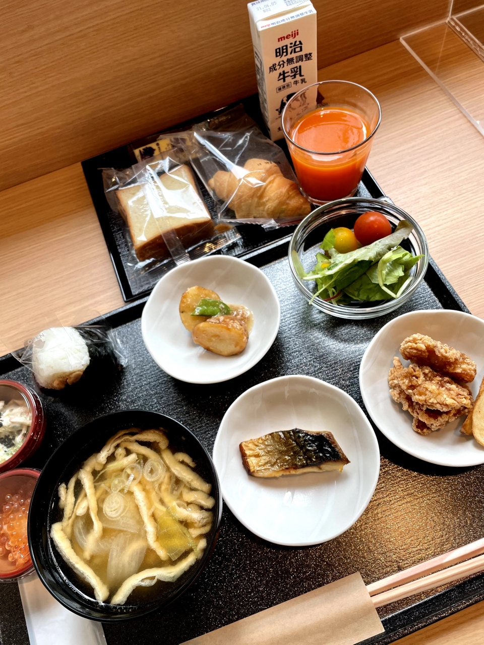 朝食は今回は都内でそこまで特徴はなかったので、噂の地方のドーミーインにも泊まってみたいです。コロナ禍でも小鉢などで工夫して朝食バイキングを提供してくださり嬉しい限りです。お味噌汁はスタッフさんによそってもらう方式でした。
