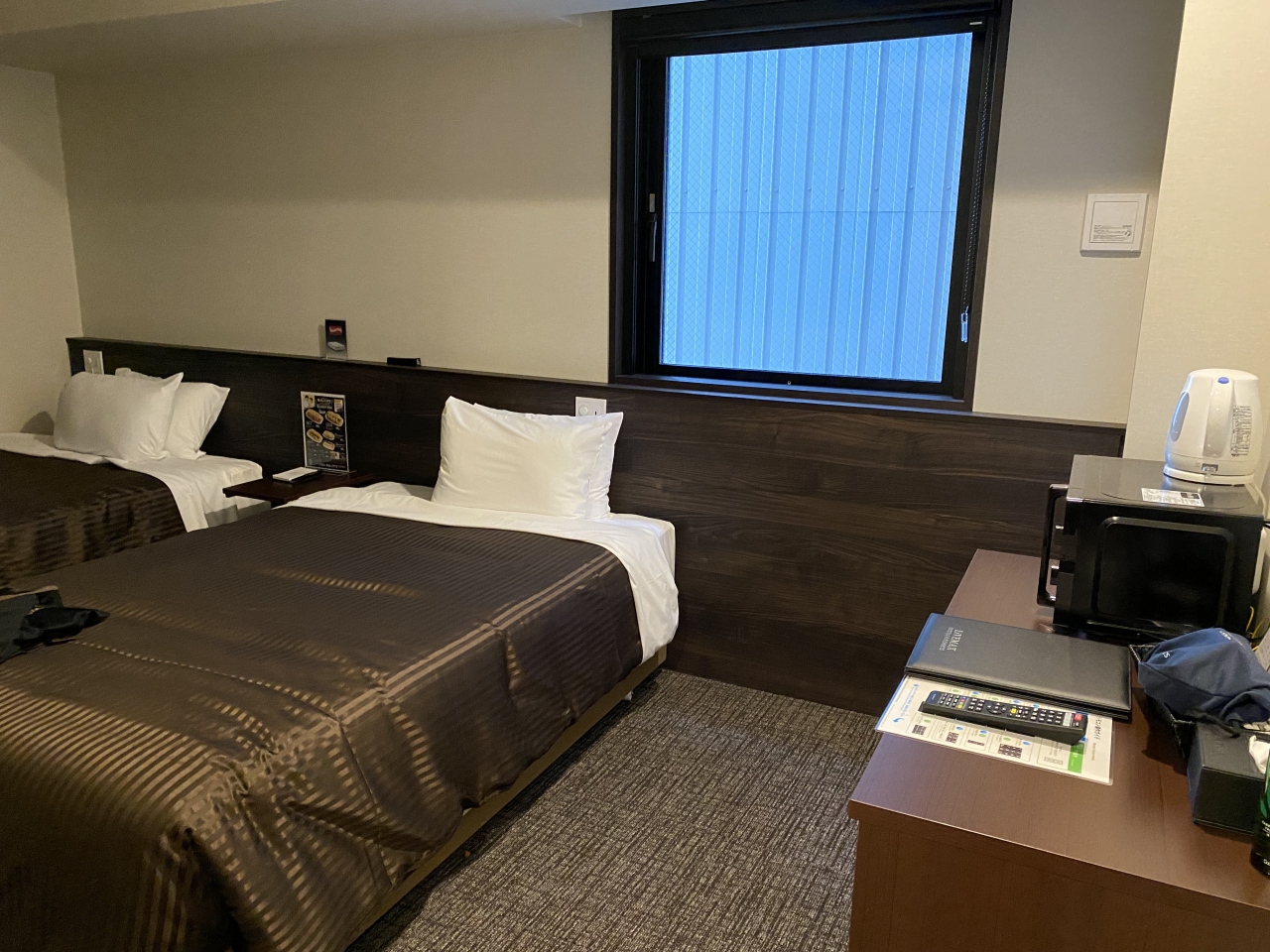 部屋はビジネスホテルのツインルームとしては、まあまあの広さ。電子レンジがあるのは驚きでした。