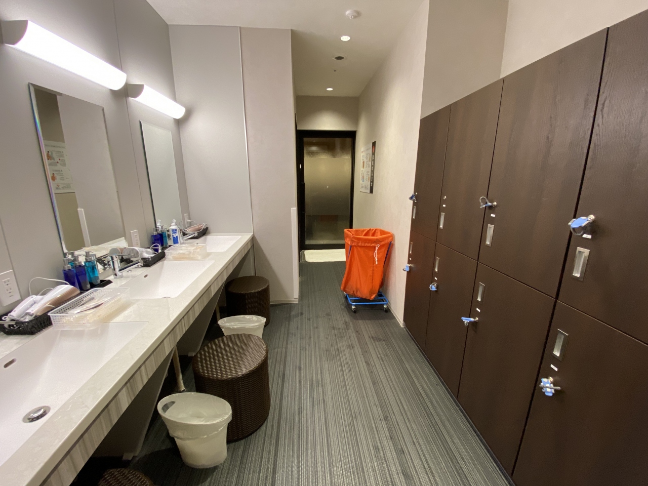 2階の天然温泉は自動ドアを開けるのにルームキーが必要です。脱衣所は鍵付きロッカーです。鏡台と向き合ってロッカーがあるので、混雑時は使い勝手が悪いかもしれません。給水機はロック解除がわかりにくくて、ちょっと使いづらい感じ。