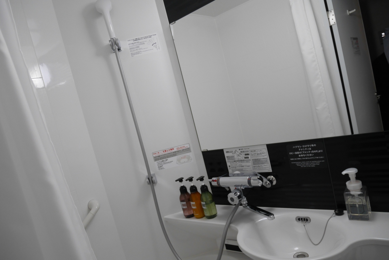 立地のかなりよいホテルです。やっぱり目的地に遅く到着した日には駅近のホテルがいいですね。バスルームも清潔でした(写真)。ぜんぜんあることを知らなかったのですが、マックスバリュにも徒歩圏内で、ホテルでの部屋飲みが好きな人にもかなりおすすめ。ベッドの寝心地もよかったです。