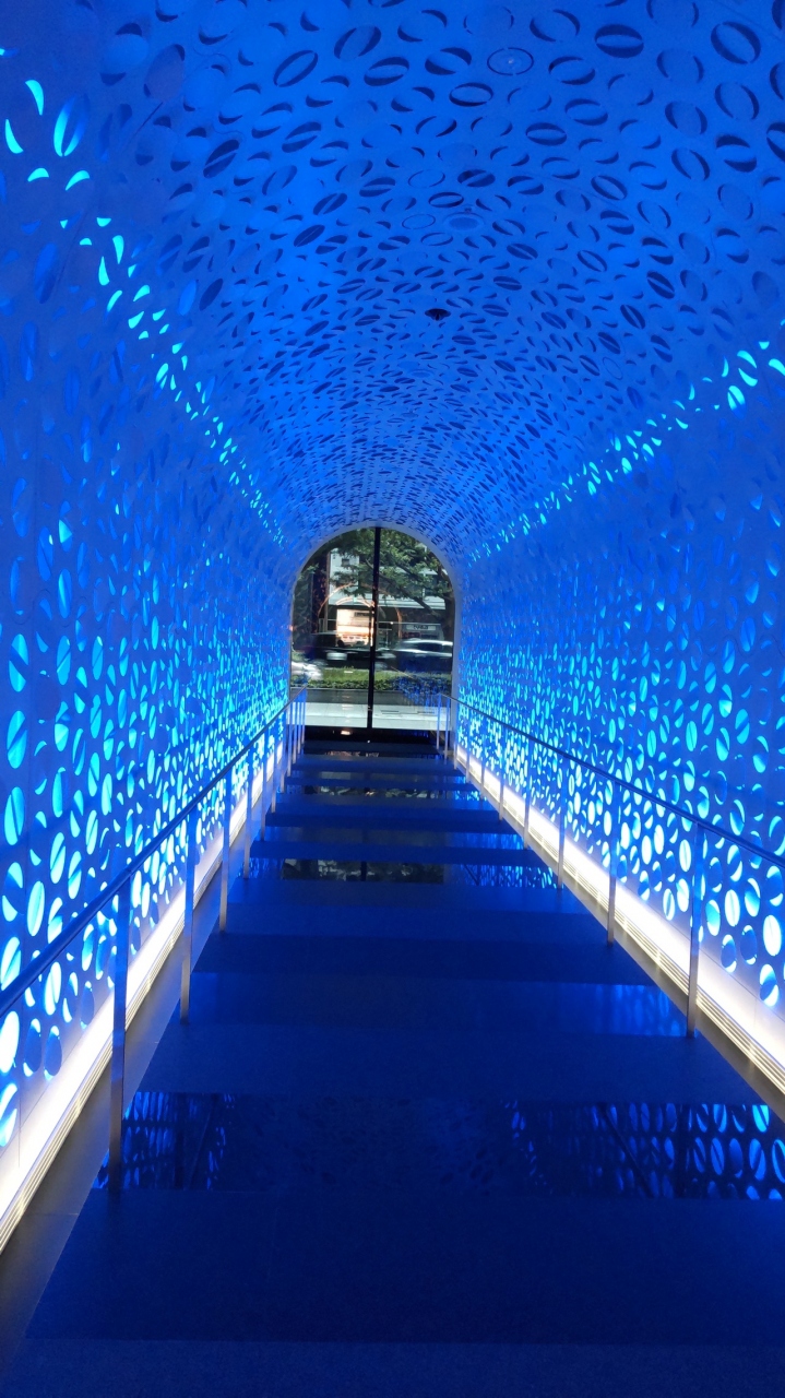 日本初のWホテル!心斎橋から少し北側にあります。入口に入るとブルーのトンネルが洞窟を思わせる、POPな雰囲気で中を覗きたくなり入りました。フロントは3Fで存在を控え目に。フロアーはリビングをイメージして食事やお酒を楽しめるスペースです。4Fにジムやスパ。ジムではブランドストリートを眺めながらランニングマシーンを!プールは宿泊者専用で、一部会員を除き1名6000円台とまぁまぁ..の印象です。ステキなホテルでした。