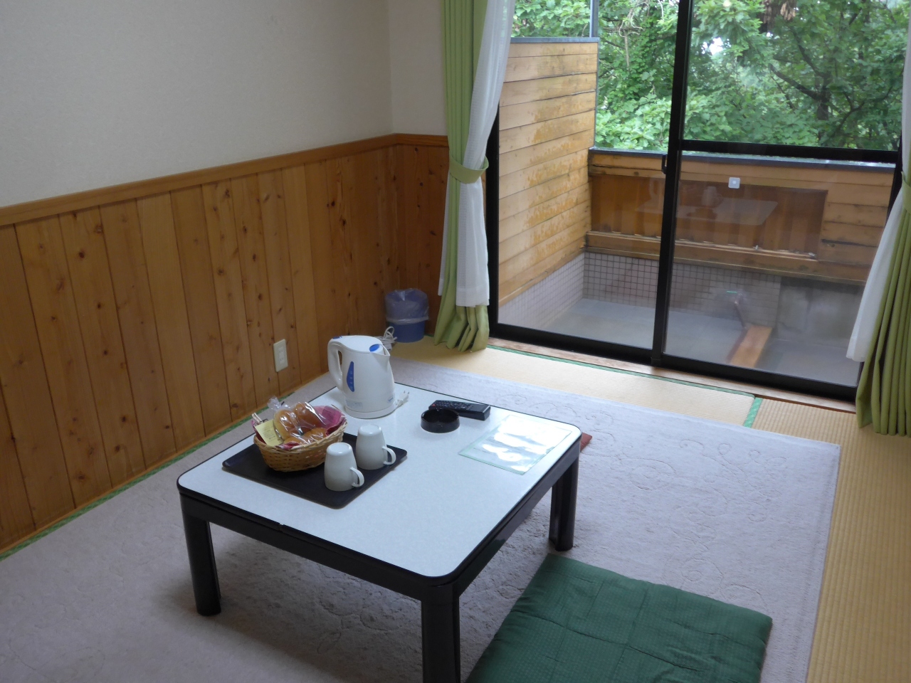 何といっても目的は温泉に入りリフレッシュする事にあったので部屋に付いている50度近い温泉が入れられる露天風呂がついていて着いたときに1/3ほど入れ冷ましてあとで入れ湯舟いっぱいにし入りました。部屋は狭いですが個づも連れ4人家族くらいまでは宿泊できる広さです。注意しないといけないのはタオル、寝間着、歯ブラシ等は無いので持参する必要があります。フロントでタオルは優良貸出しています。