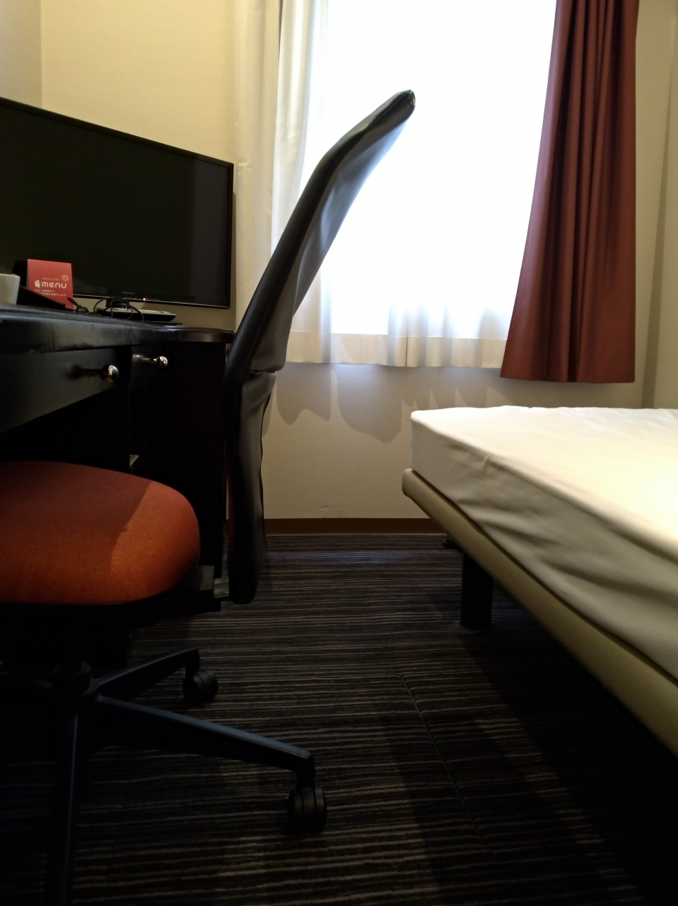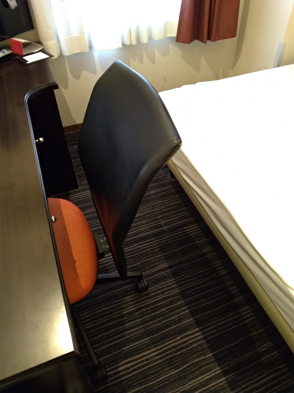 椅子がでかい。背もたれがでかい。本当に邪魔でした。窓側への移動は常にカニ歩きでした。ビジネスホテルなので部屋が狭いのは問題ないのですが、部屋の大きさに合った椅子にしてもらいたいところです。邪魔で邪魔で、使わないときは入口の方に放り出していました。
