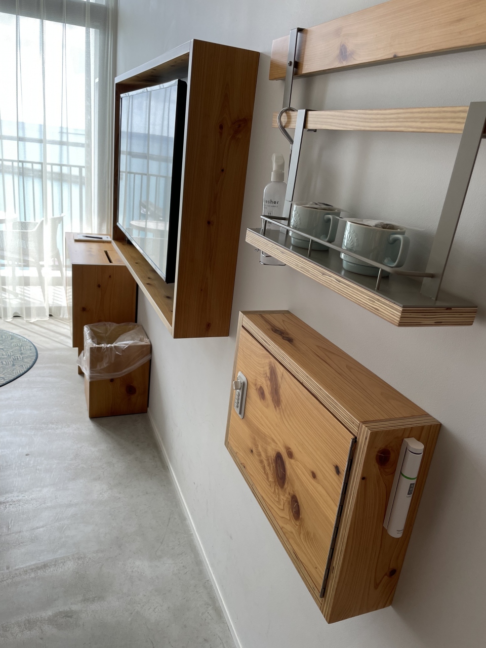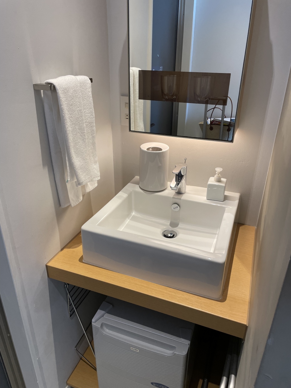 棚とかいろんな収納スペースが全て薄め(笑)ですのでアメニティを広げたりとかも厳しいです。