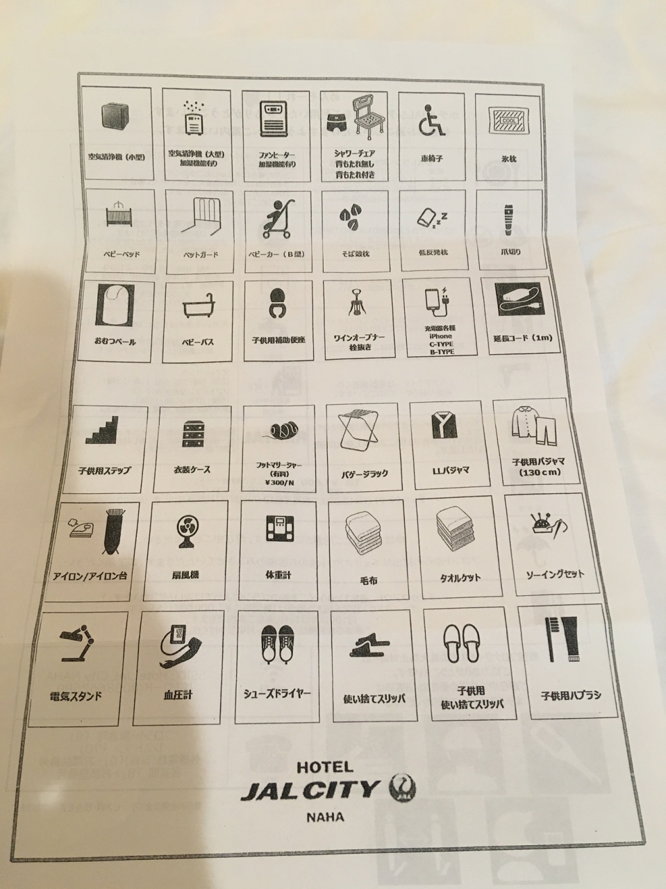 部屋はシンプルですがリクエスト制の貸出品が充実しています。フロントには有料レンタルのかりゆしウェアもあり着用して沖縄気分を盛り上げるのも良さそうです。