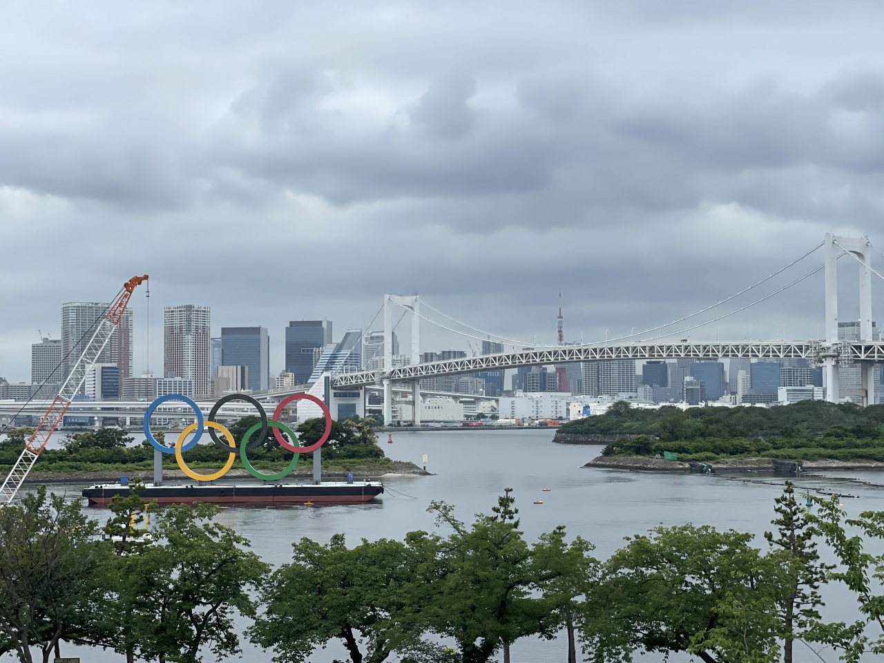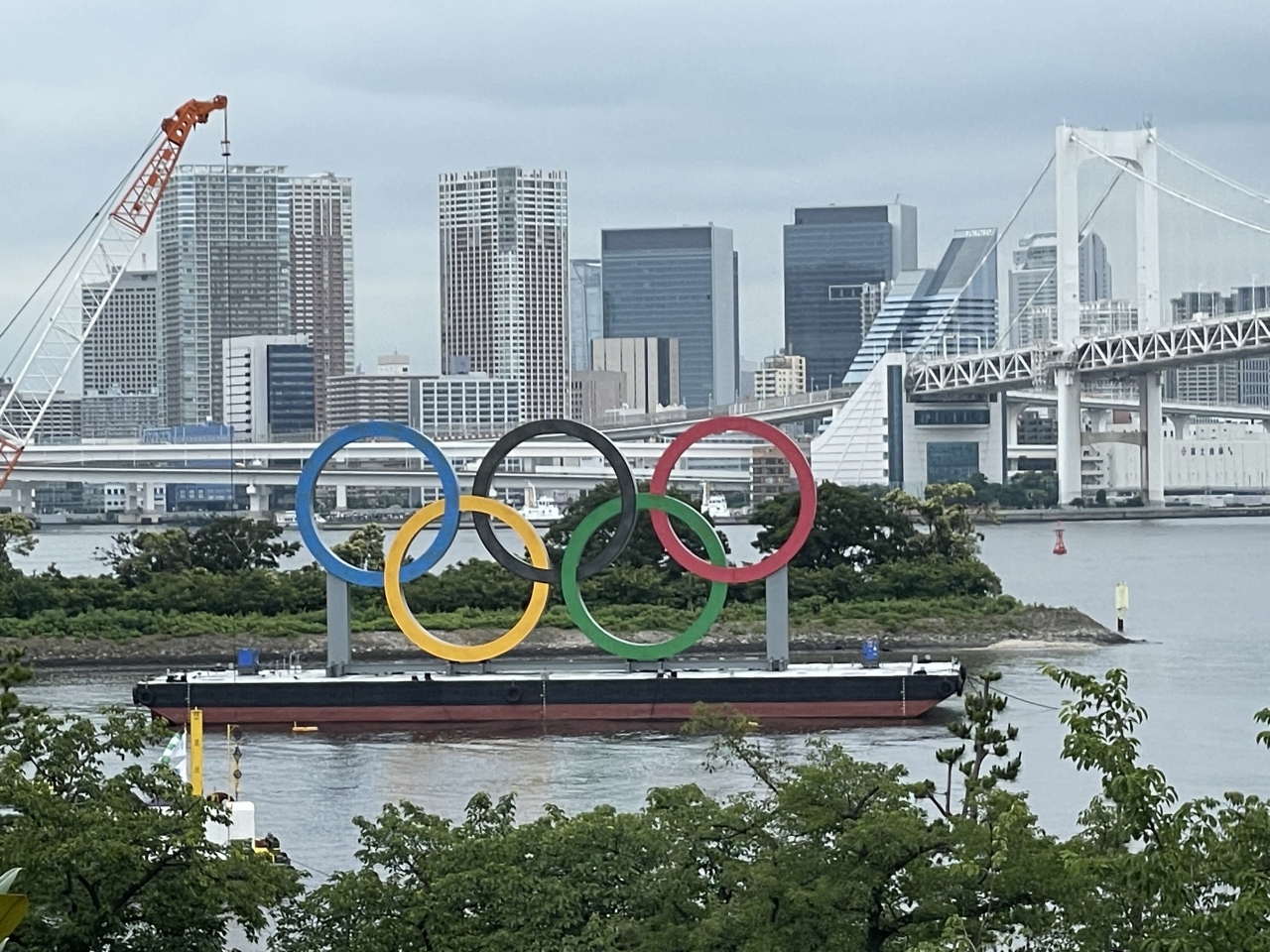 五輪期間中、お台場海浜公園周辺は、競技エリアを封鎖するために、広範囲にわたって囲いが設置されている為、海上に浮かぶ巨大五輪マークオブジェとレインボーブリッジを両方とも写真に収める為には、お台場西側に行く必要があります。