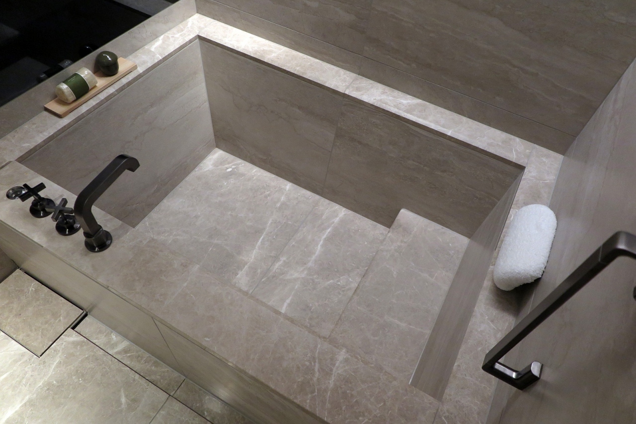 - まるで温泉のような造りのバスルームはテレビ付き、素晴らしい