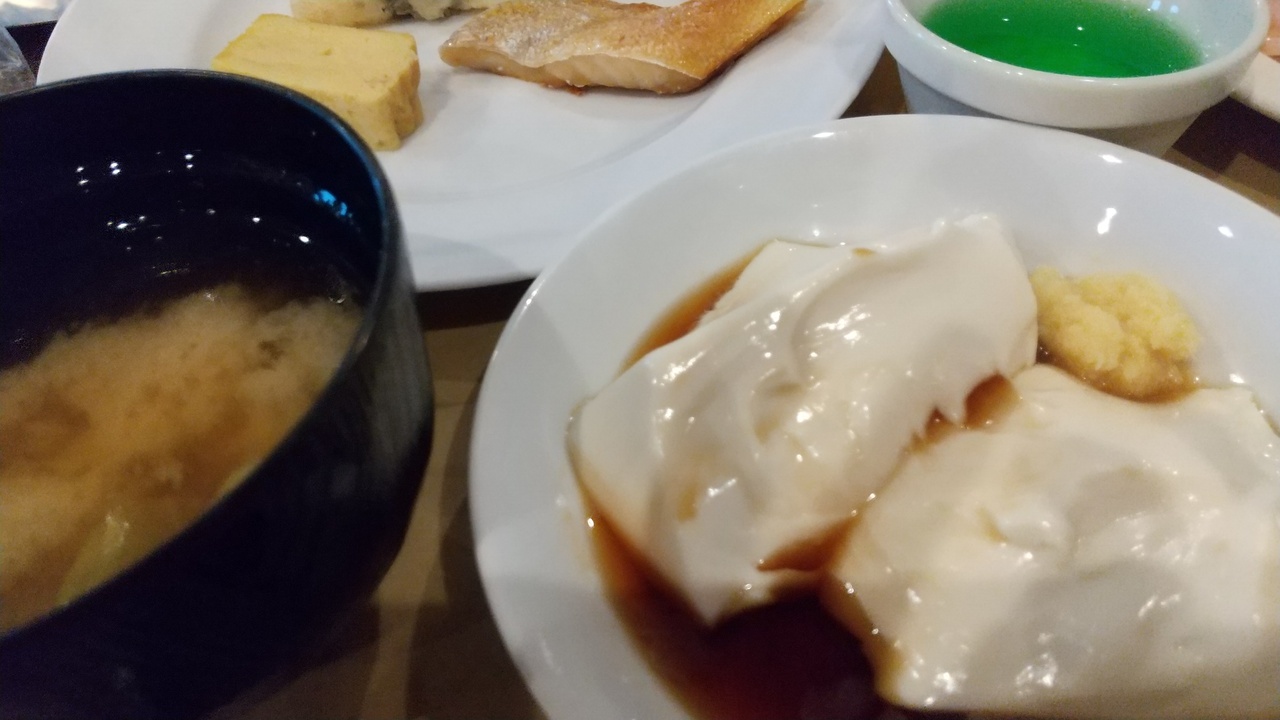 朝食の品数は多くないですが、手作り豆腐がとても美味しかった。