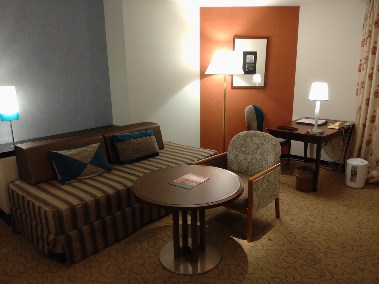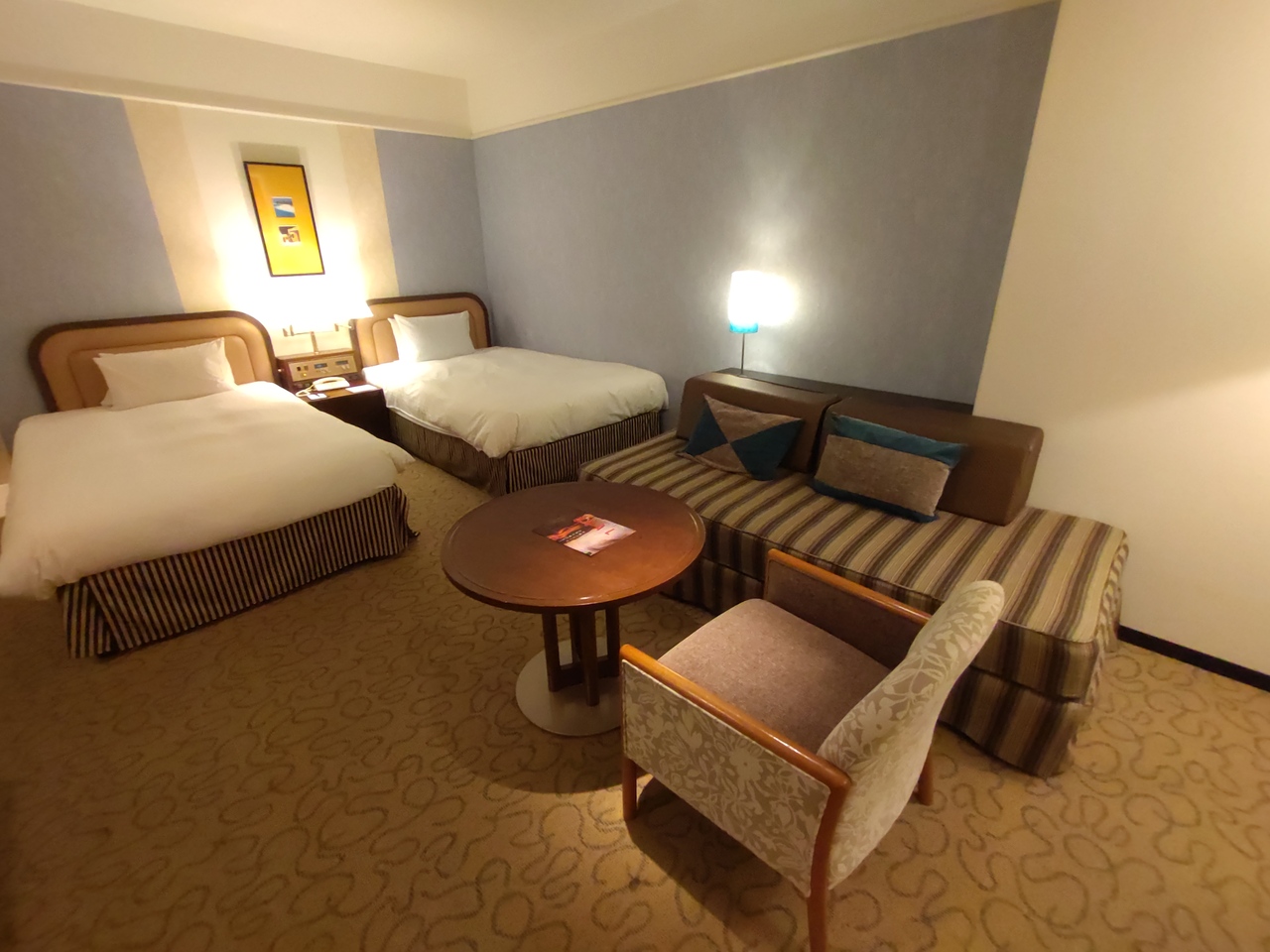 夜のフライトで神戸空港に到着し、寝るだけの宿として2名素泊まりで1万円の格安プランで予約しましたが、グレードアップされてリッチな気分を味わえました。南館の下層階のツインで40平方メートル近い広さにデスクとソファーベッドとベランダつき。実質的にジュニアスイート並み? 景色は楽しめなかったもののコスパは最高でした。