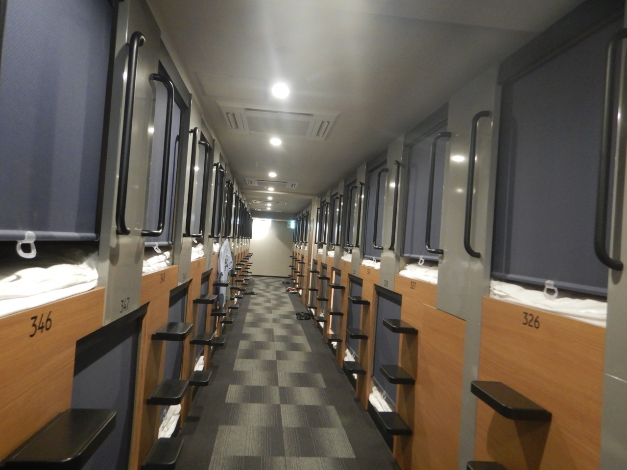 キャビンタイプ、いわゆるカプセルタイプ。多数のベッドが並んでいる部屋に泊まった。 4トラ→楽天とレベル経由で予約。朝食付きで3000円。楽天トラベルのクーポンで500円引き、自分が持っている楽天ポイントを500円分使う。