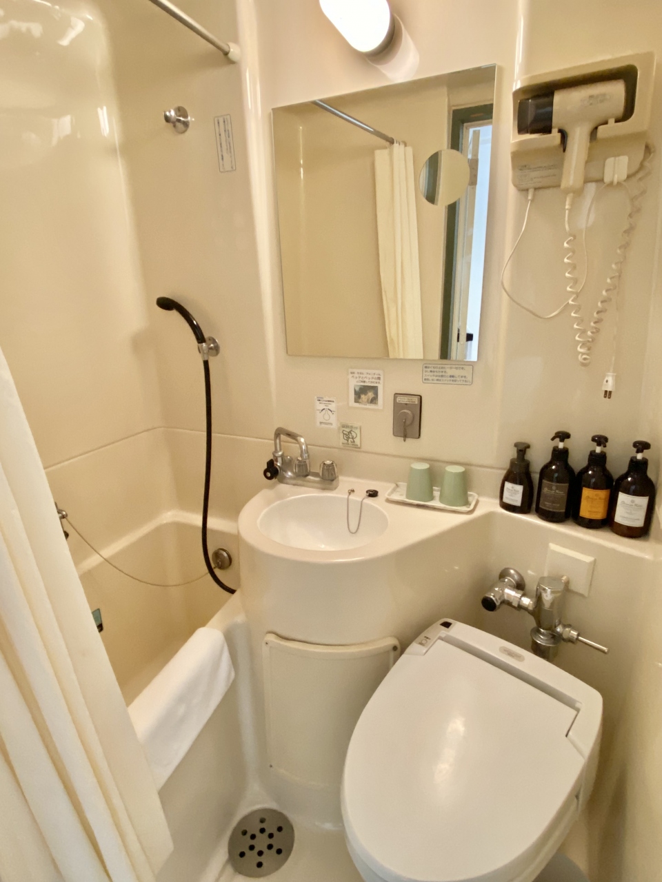 部屋はまあまあ普通の広さ。ただし、バス&トイレルームは数々の泊まったホテルの中でも、一番の狭さでした。カーテンが身体に付くのが少々気持ち悪く、使い方にコツが必要でした。