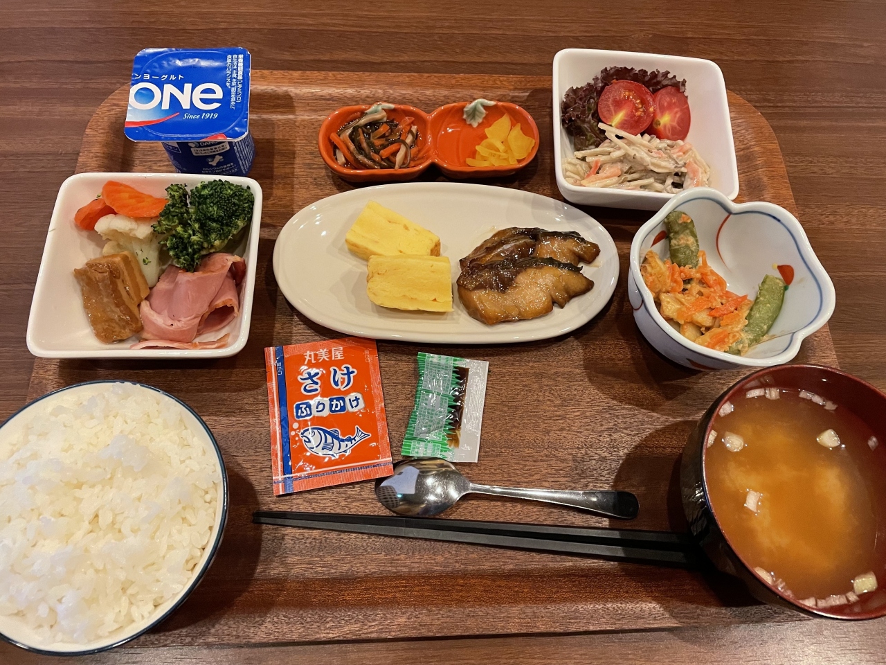 朝食は別館1階のレストランで、和食のプレートですが、まあまあおかずの種類もありました。無料コーヒーは本館にしかないので、食事の配膳待ちの間に取りに行きました。