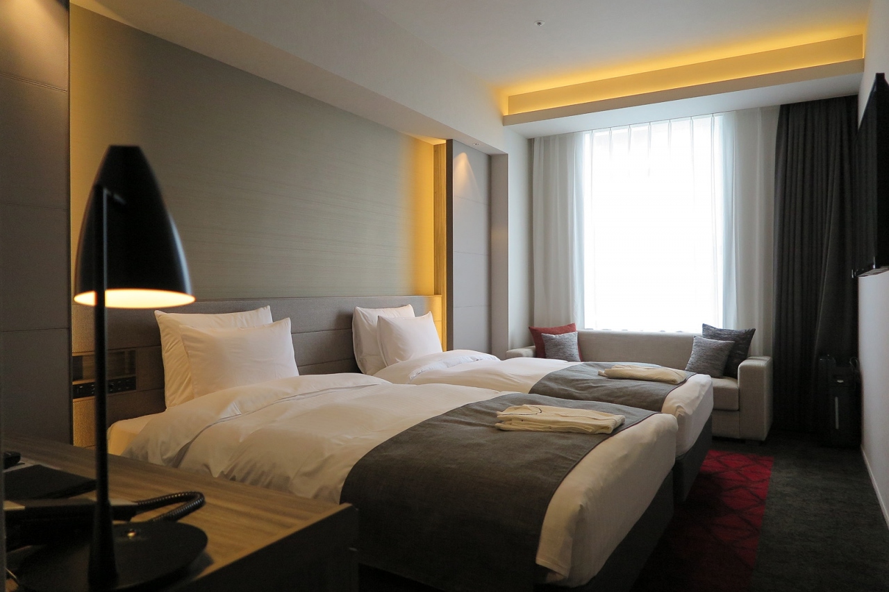 地下鉄「赤坂」駅、その3番出口から私の足で50歩以内、時間にして30秒以内に到着できます。2021年3月15日に開業したばかりとあって、館内はピカピカ、とても綺麗です。JALシティブランドでありながら、メインロビーには案内係のスタッフが配置されていました。客室はスーペリアツイン、客室面積は28平米ですが、余計な調度品のない合理的なデザインですから、ベッド2台&大きなソファーが入っても余裕の広さ、コーヒーマシンもありましたし、43型4KテレビでYouTubeなども楽しめ、とてもくつろげました。またバスルームも洗い場付きで、しっかりと入浴ができました。