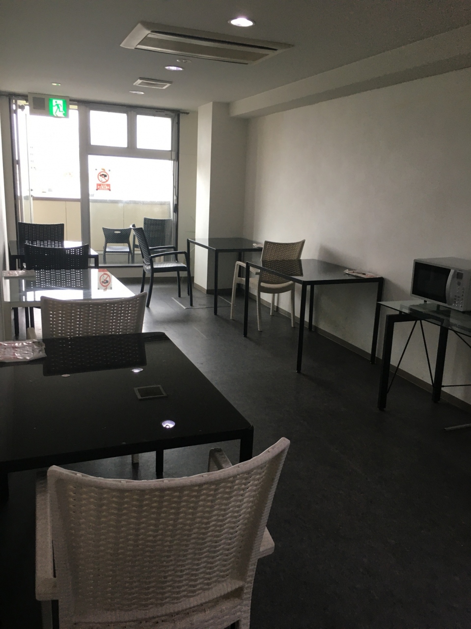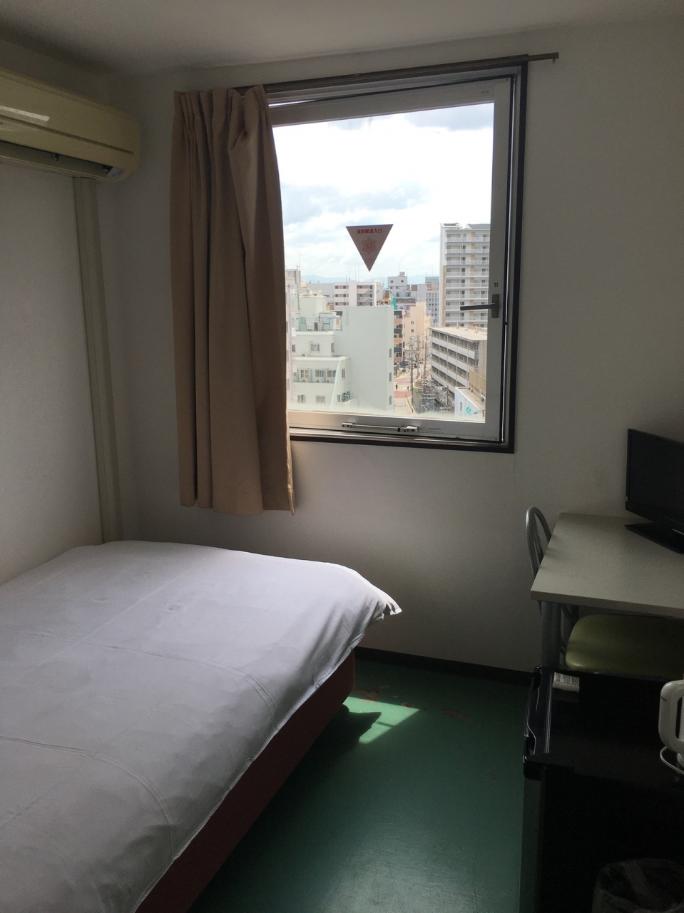 角の部屋だったので街並みの景色が見れました。部屋にはトイレも完備していてシングルベット、卓、ミニ冷蔵庫のみがある狭い部屋でしたが寝るだけなら十分でした。1階フロント前にはパソコンと重厚感ある椅子がある談話室があり、外貨自動販売機もありました。