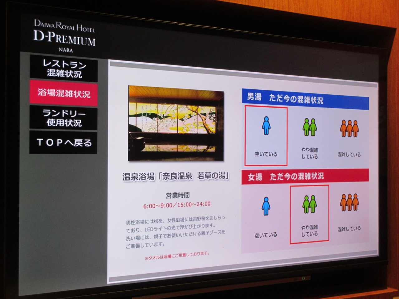 部屋のテレビで混雑状況が分かるのだが、ズレはある。