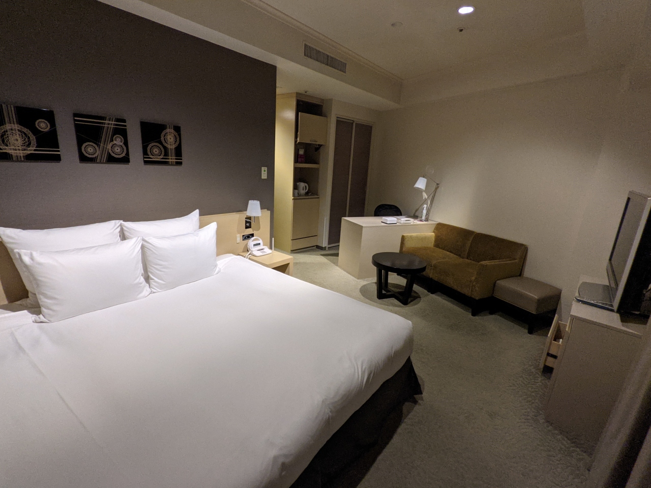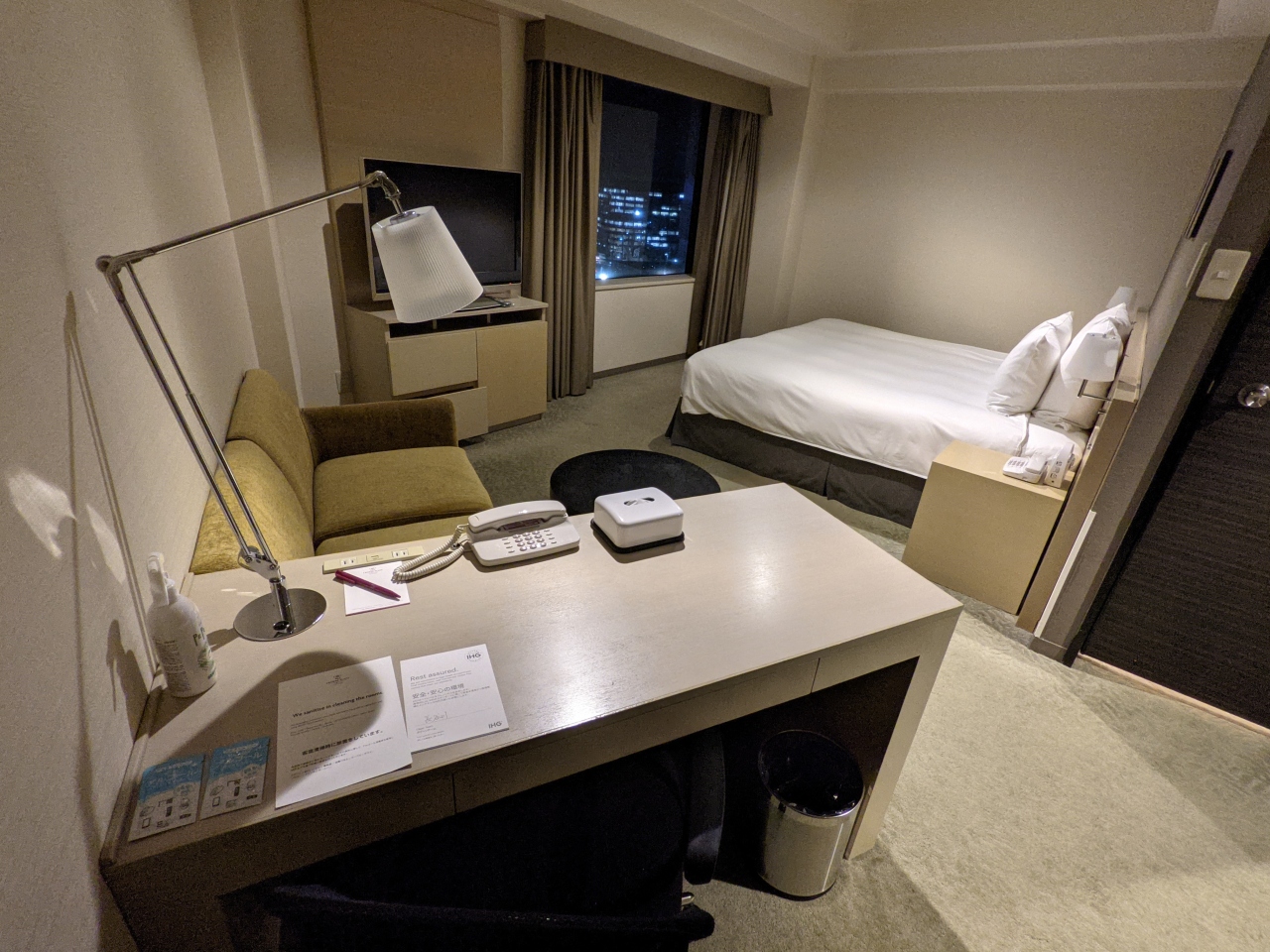 金沢駅東口すぐの旧全日空ホテル。ぱっと見は結構古い感じでお隣のぴかぴかの日航ホテルに見劣りする感はあります。その分お値段も控えめですが。最安値部屋からスーペリアルームの角部屋にアップグレードしてもらいました。ざっと30平米はあって広いです。西側だったので眺望は普通のシティビュー。ソファがあるのが良い。マンボウのためワンドリンクチケットはなし、ポイント一択のみ。チェックアウトは14時まで。まあまあといった感じ。