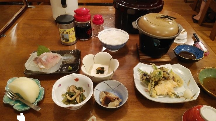 夕食は山菜やキノコ、岩魚など山の恵みがふんだんに味わえるメニュー。日常、なかなか味わうことができない食材の数々に旅をしている実感が湧く。