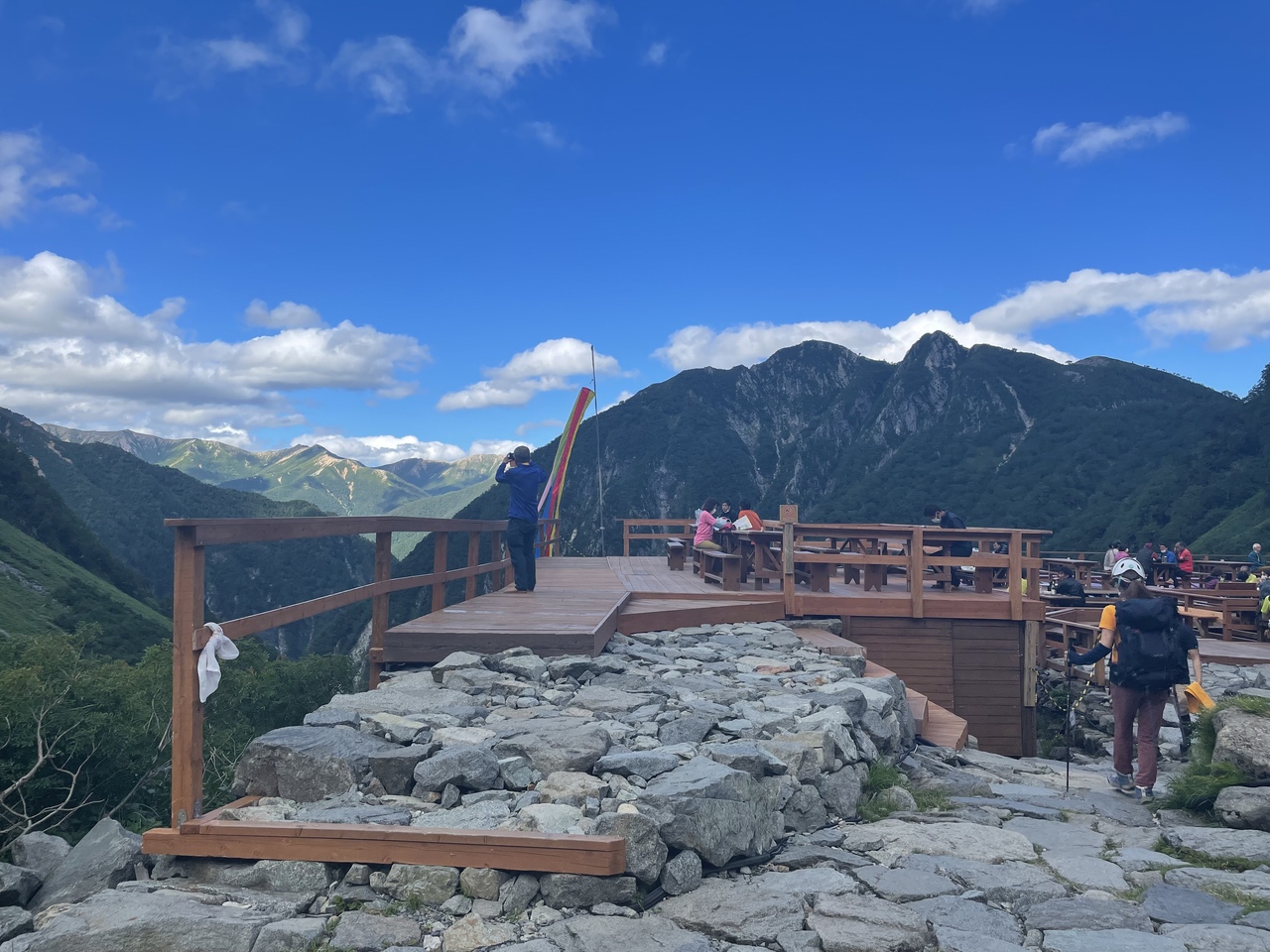 紅葉前に行ったため混んでおらず、テラスでのんびりと過ごせたのが最高でした。景色を見ながらのコーヒーは、数時間歩いてきた甲斐があったと思いました。テラスの売店メニューも充実しています。山小屋とは思えぬほど品目の多い豪華な夕食で、スタッフも皆さんとても親切でした。運良く見れた朝焼けは感動ものです。注意点としてドコモは全く使えず、ソフトバンクはヒュッテの場所によって使える場合もあったそうです。