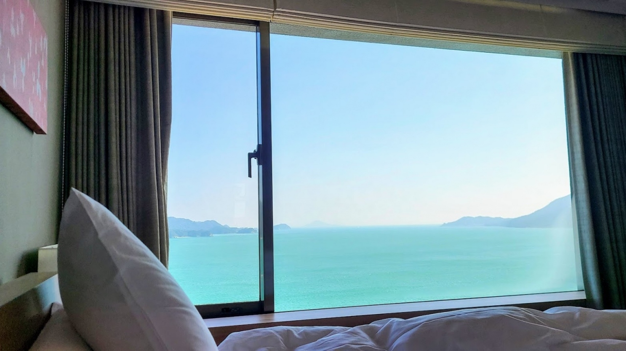 オーシャンビュースイートのお部屋から見える鳥羽湾は青くてとてもキレイです。