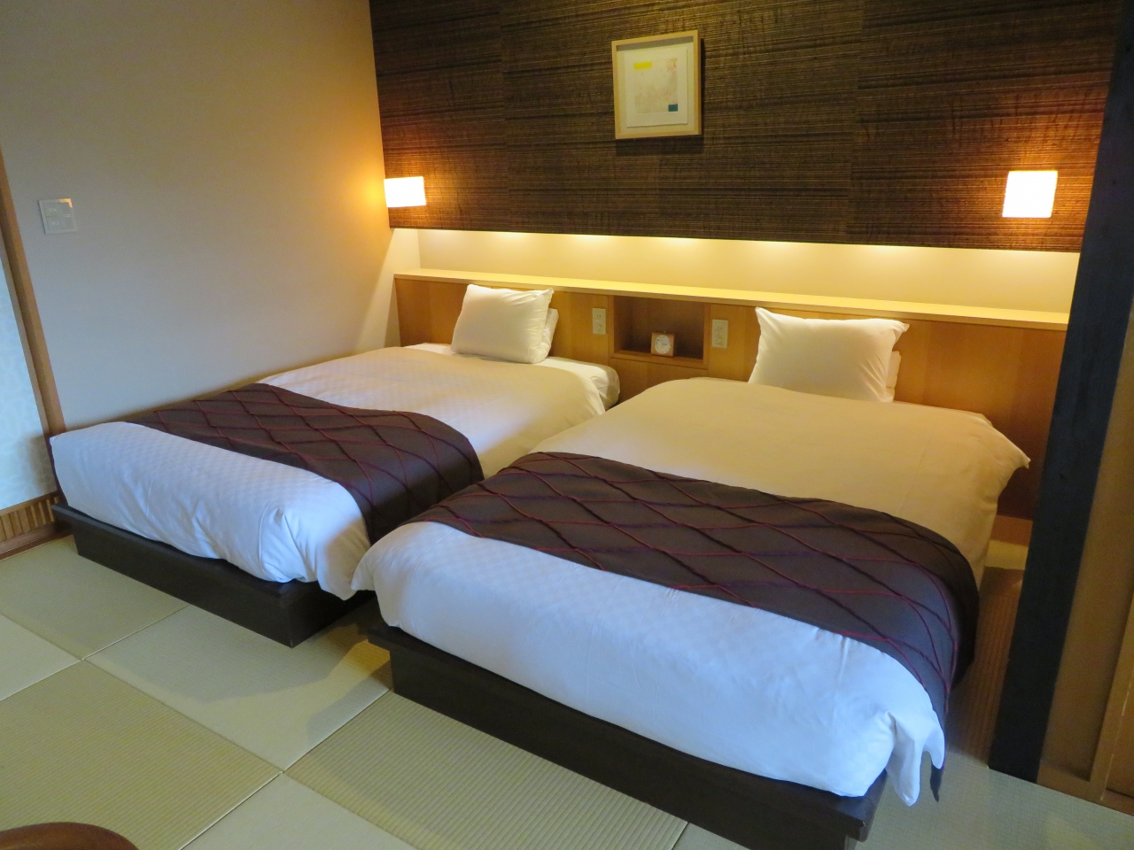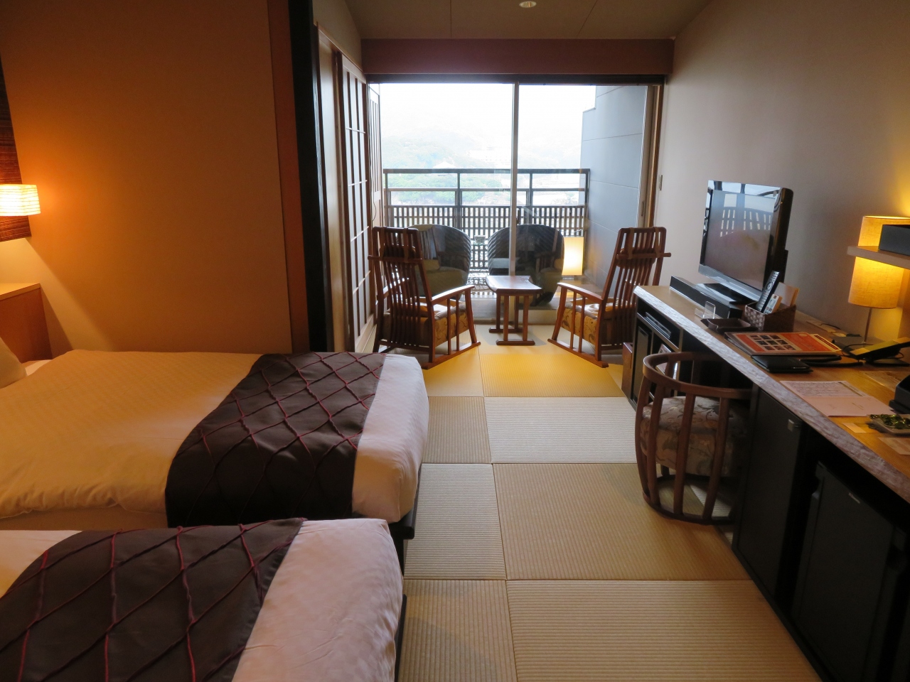 お部屋も和の雰囲気が素敵で、お部屋のお風呂に浸かって景色を眺められるものいい。