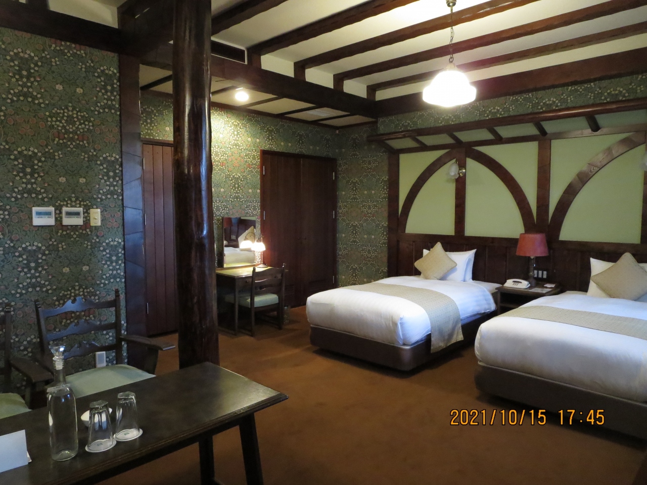 お部屋はウイリアムモリスの壁紙、天井や柱などに木があしらわれていてホッとする雰囲気を醸し出しています。