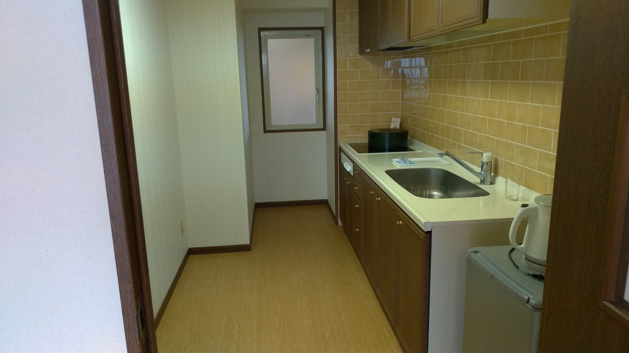 キッチンにはIH調理器があり、小型冷蔵庫は製氷はできるが
