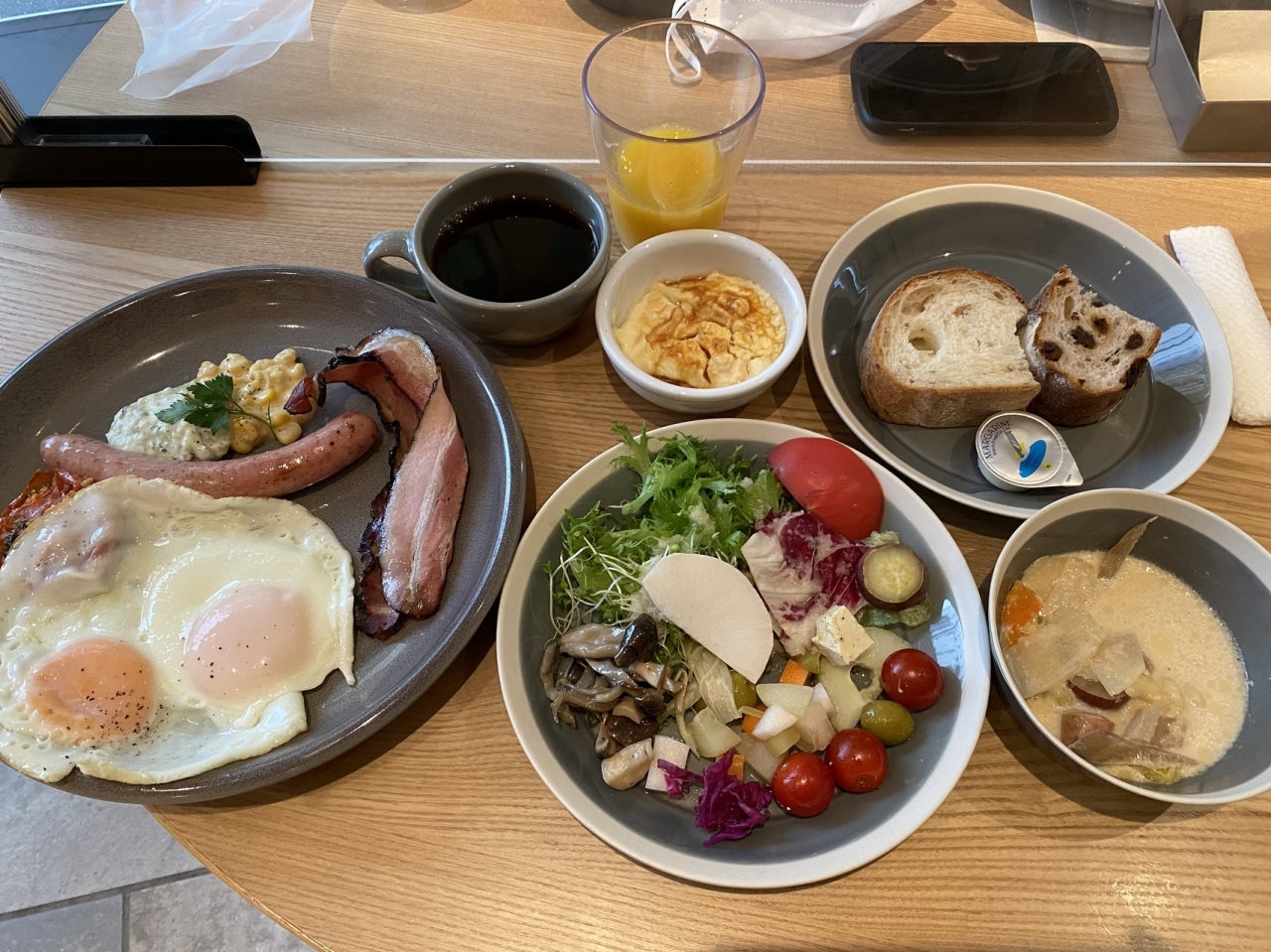 ワンプレートはエッグベネディクト、オムレツ、目玉焼きから選べます。デザートのプリンも濃厚で美味でした。